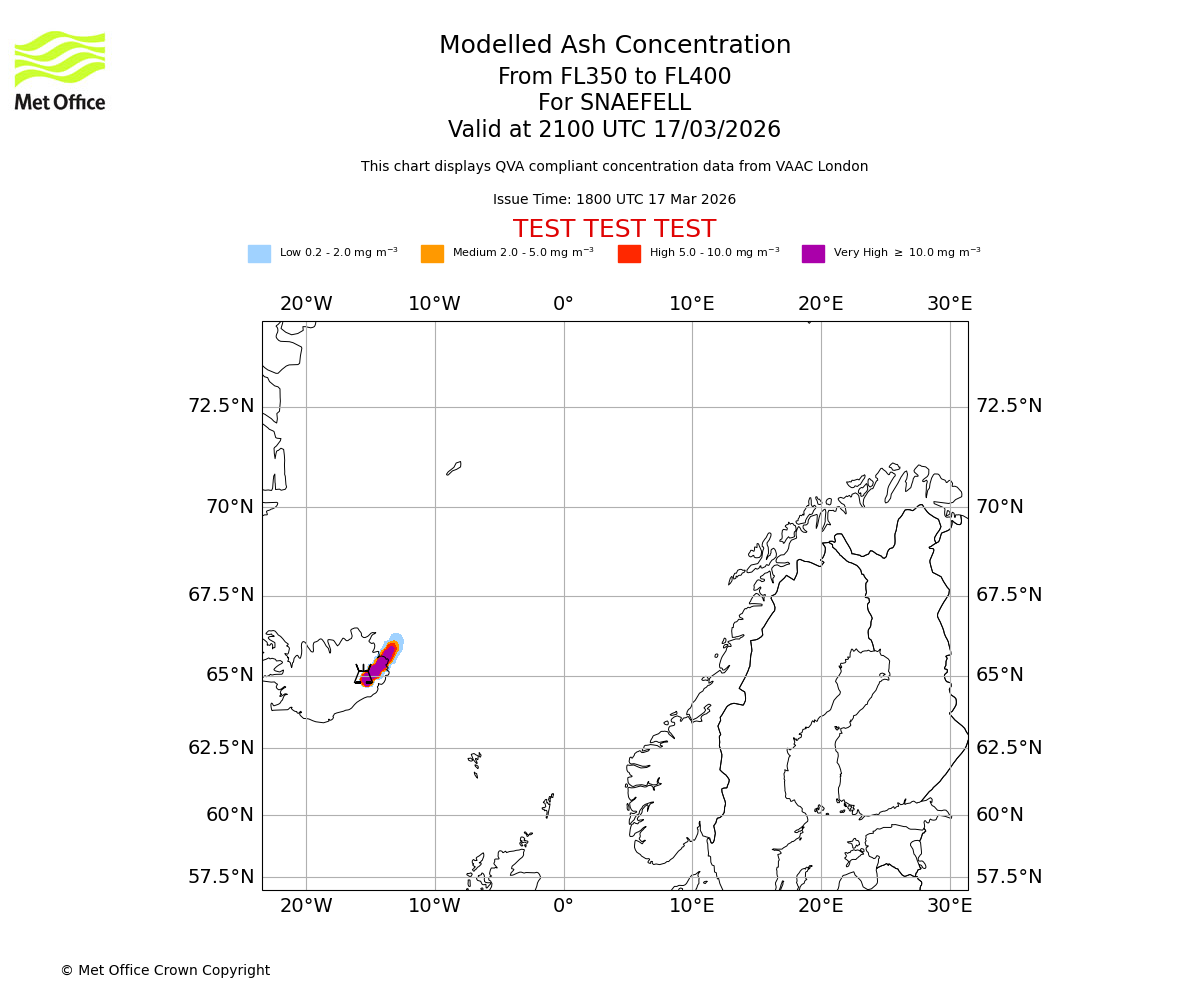Modelled ash concentration from 350 to 400 for SNAEFELL. Valid at 1800 UTC 17/03/2026