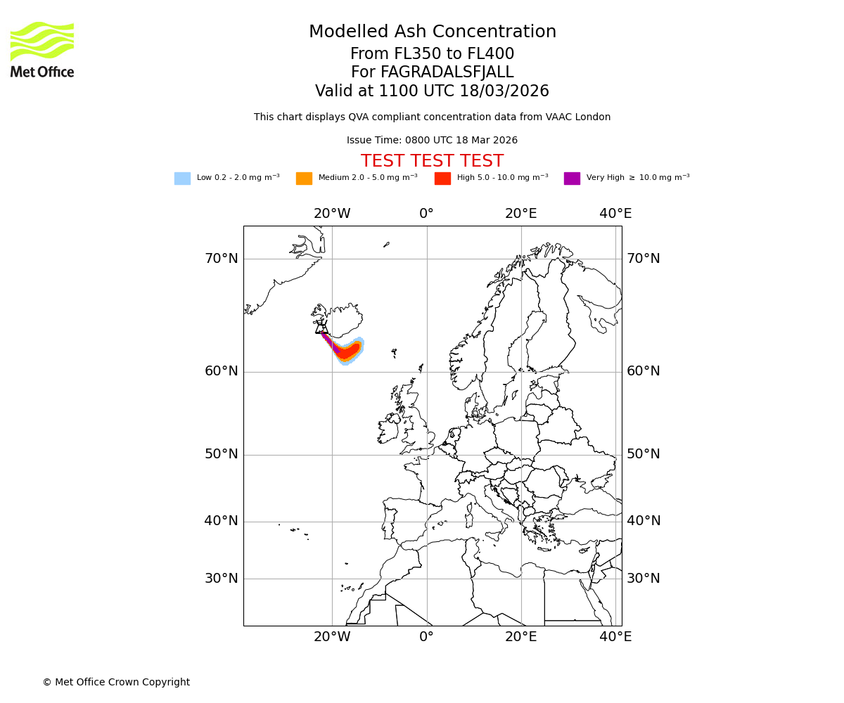 Modelled ash concentration from 350 to 400 for FAGRADALSFJALL. Valid at 0800 UTC 18/03/2026