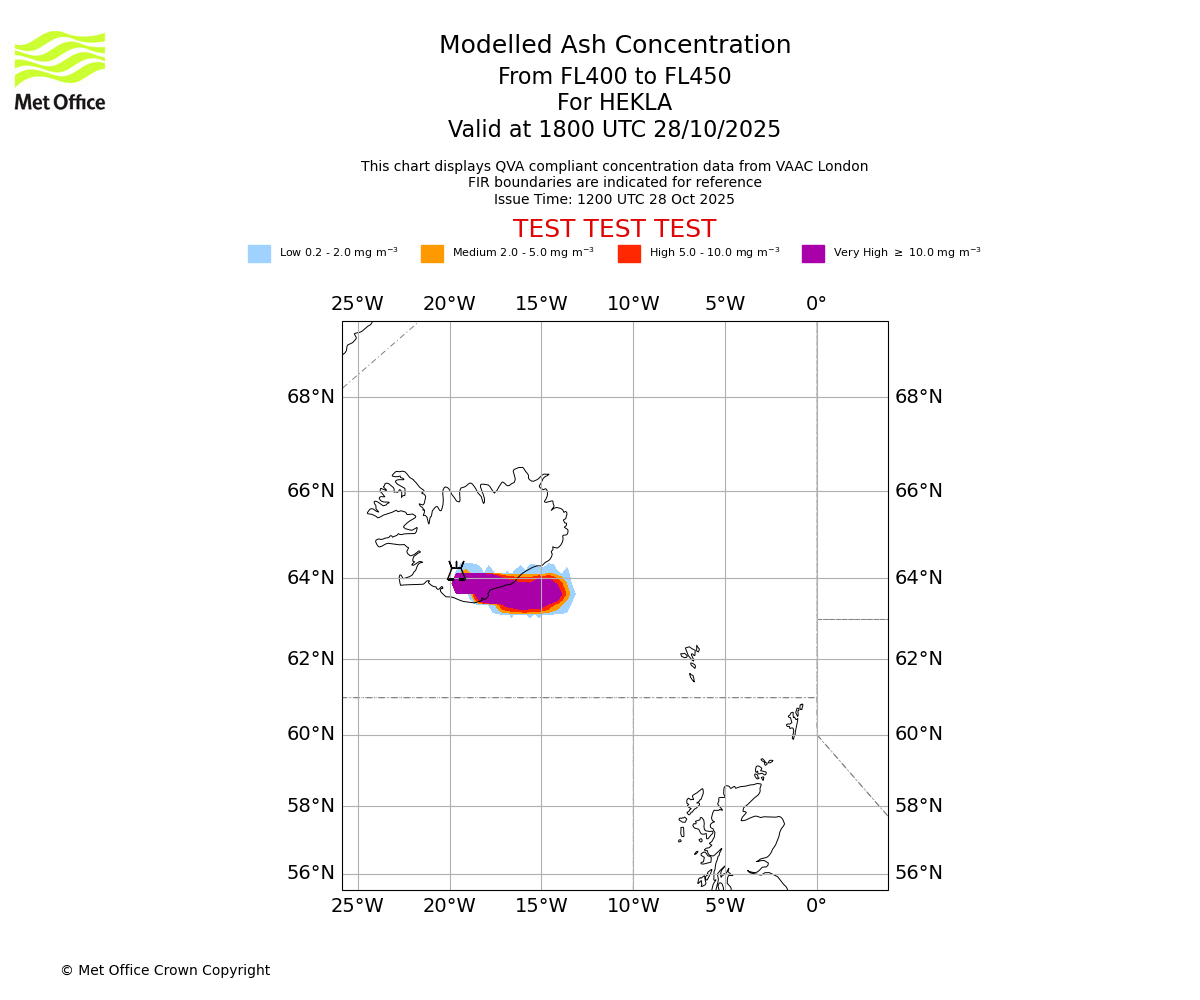 Modelled ash concentration from 400 to 450 for HEKLA. Valid at 1500 UTC 28/10/2025