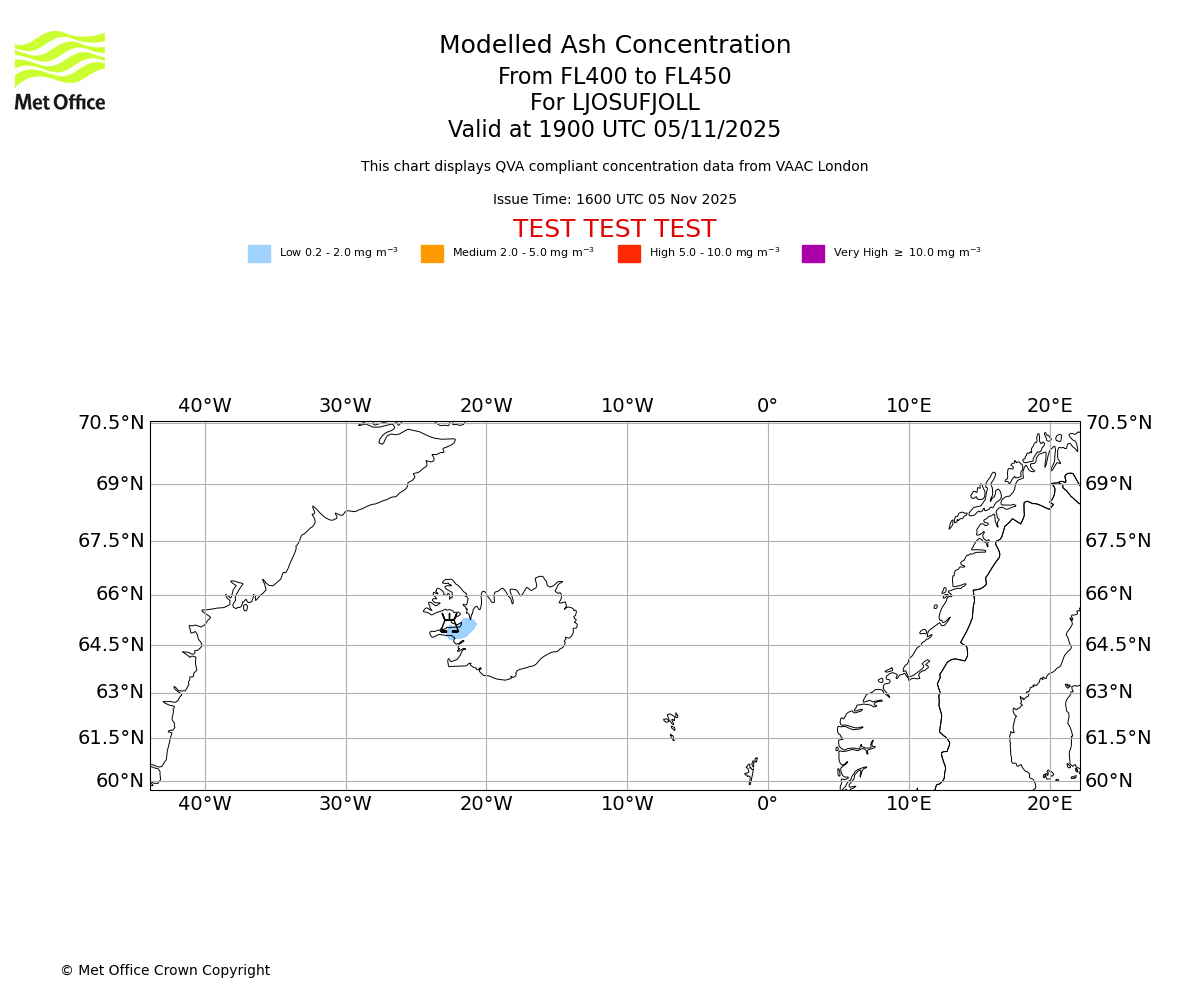 Modelled ash concentration from 400 to 450 for LJOSUFJOLL. Valid at 1600 UTC 05/11/2025