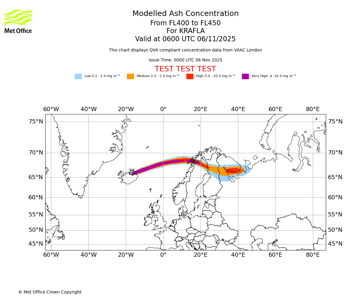 In accordance with ICAO Annex 3, Amendment 82 VAAC London will provide operational QVA forecasts from 27 November 2025 and these will be made available via a VAAC London QVA API information service. These charts are currently provided for test and evaluation purposes (not for operational use) until the introduction of the operational service.