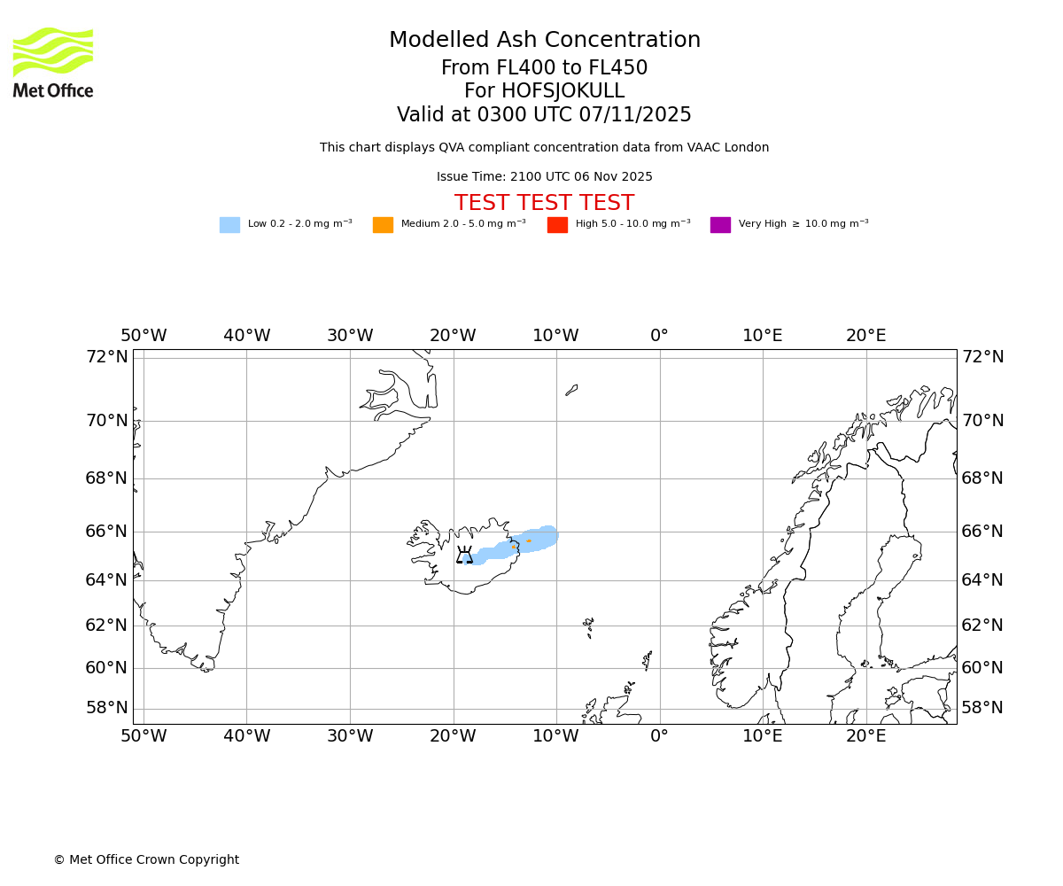 Modelled ash concentration from 400 to 450 for HOFSJOKULL. Valid at 0000 UTC 07/11/2025