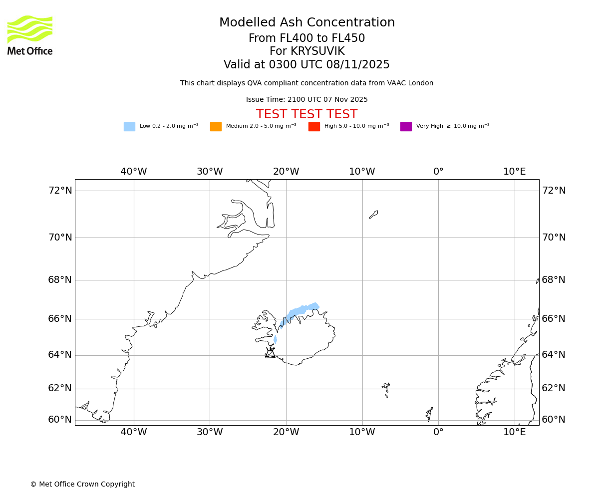 Modelled ash concentration from 400 to 450 for KRYSUVIK. Valid at 0000 UTC 08/11/2025