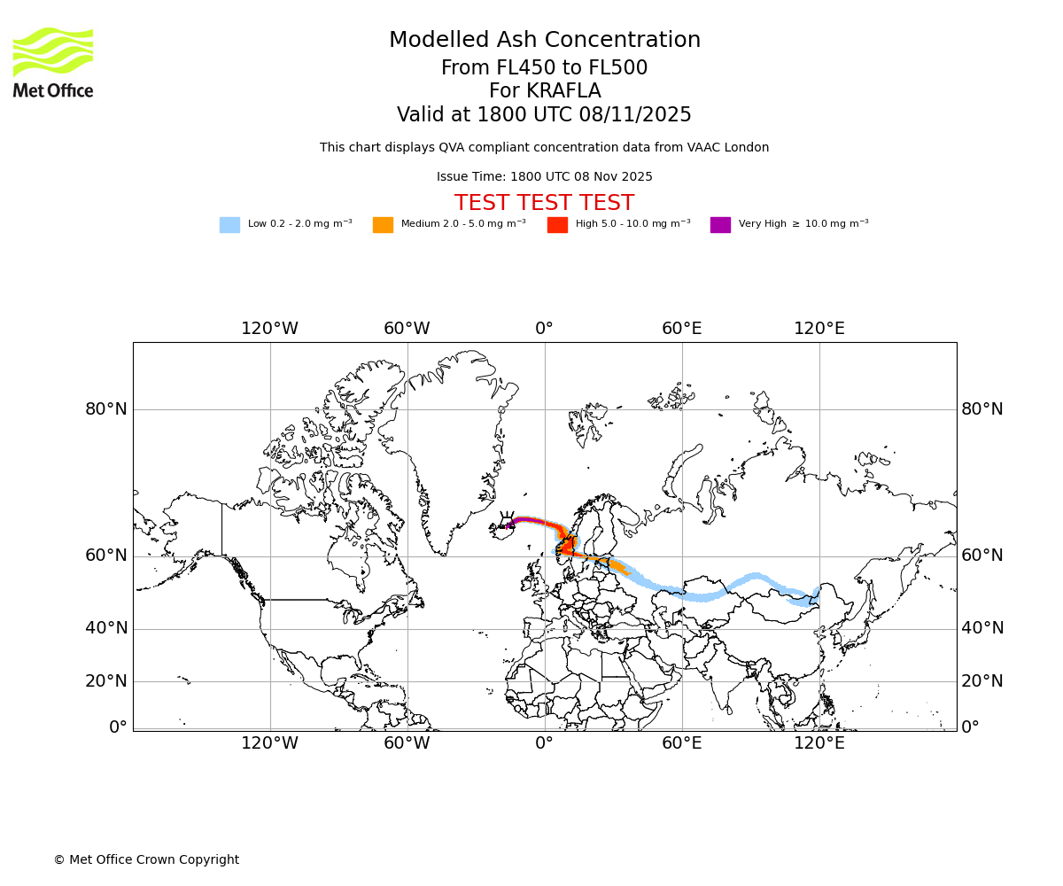 Modelled ash concentration from 400 to 450 for KRAFLA. Valid at 1800 UTC 08/11/2025