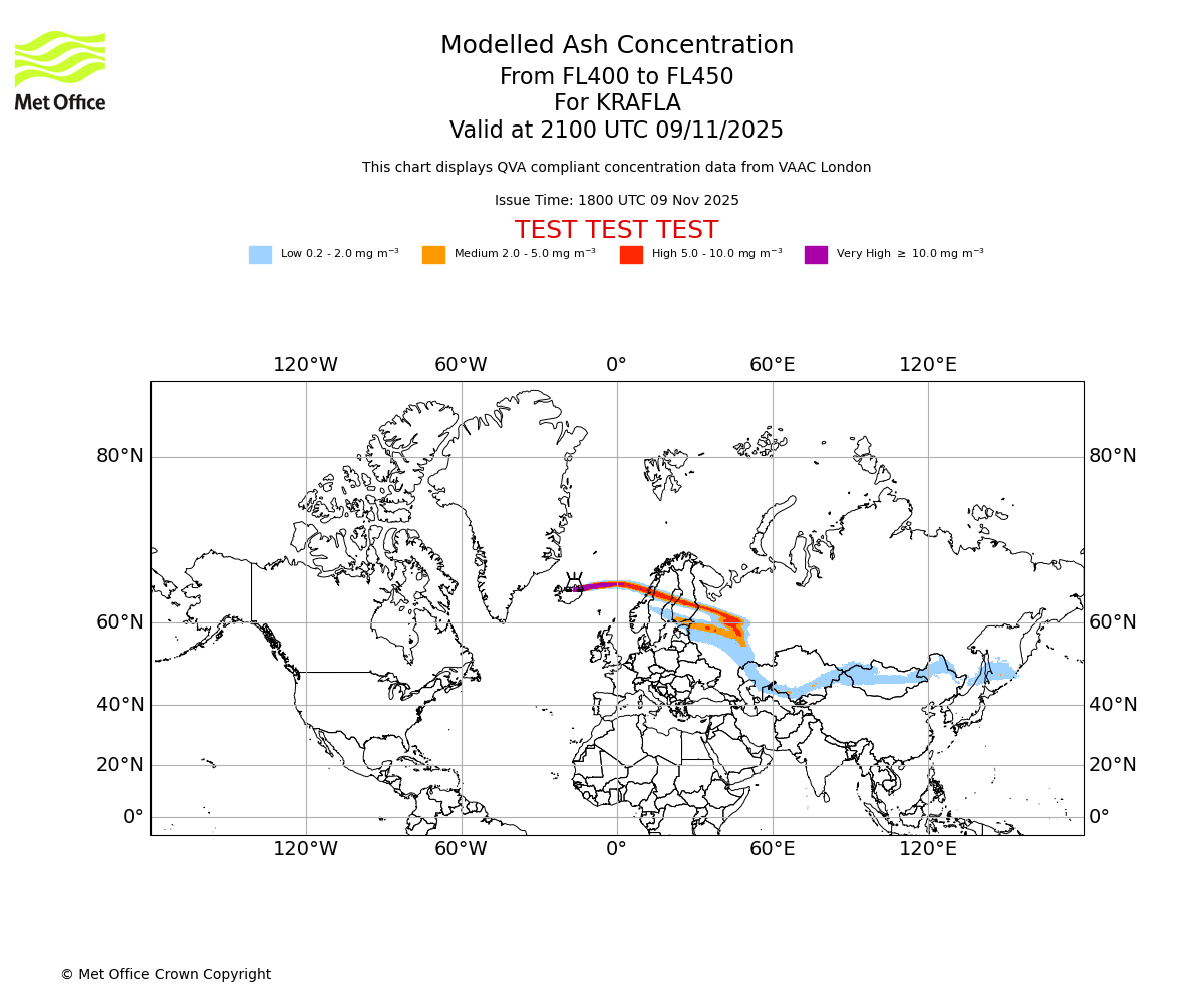 In accordance with ICAO Annex 3, Amendment 82 VAAC London will provide operational QVA forecasts from 27 November 2025 and these will be made available via a VAAC London QVA API information service. These charts are currently provided for test and evaluation purposes (not for operational use) until the introduction of the operational service.