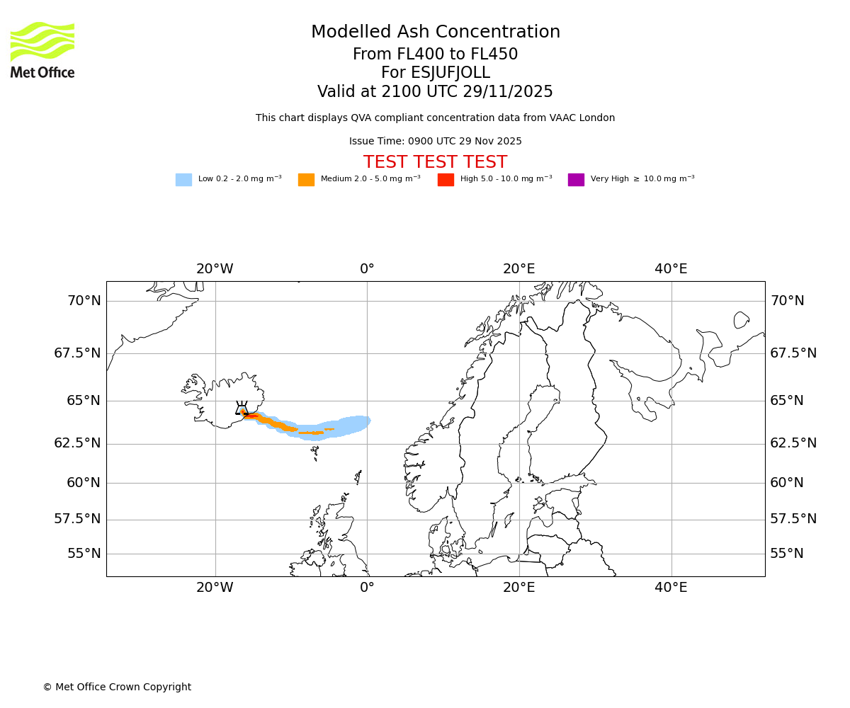 Modelled ash concentration from 400 to 450 for ESJUFJOLL. Valid at 1800 UTC 29/11/2025