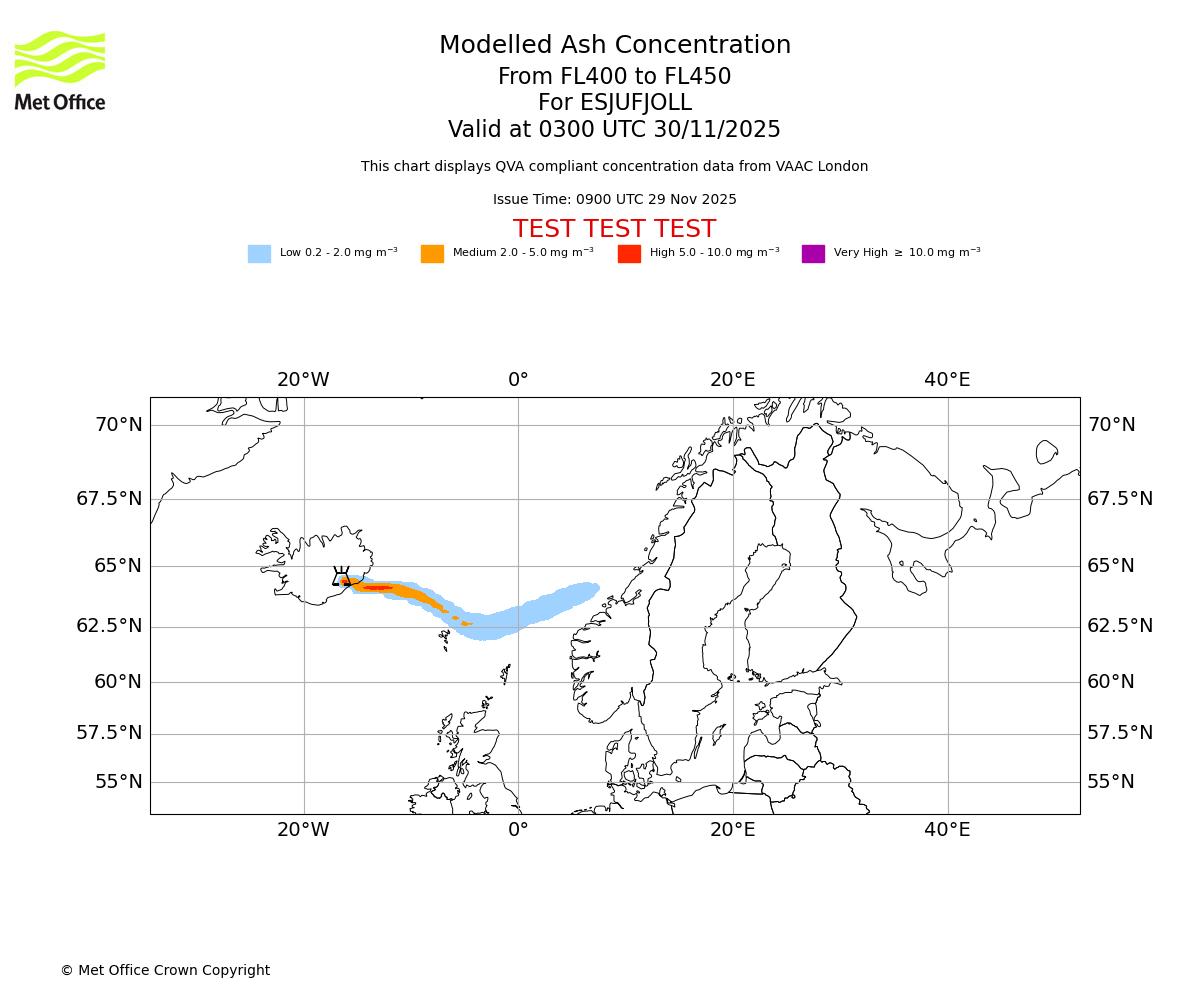 Modelled ash concentration from 400 to 450 for ESJUFJOLL. Valid at 0000 UTC 30/11/2025