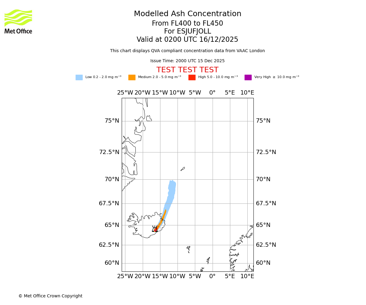 Modelled ash concentration from 400 to 450 for ESJUFJOLL. Valid at 2300 UTC 15/12/2025