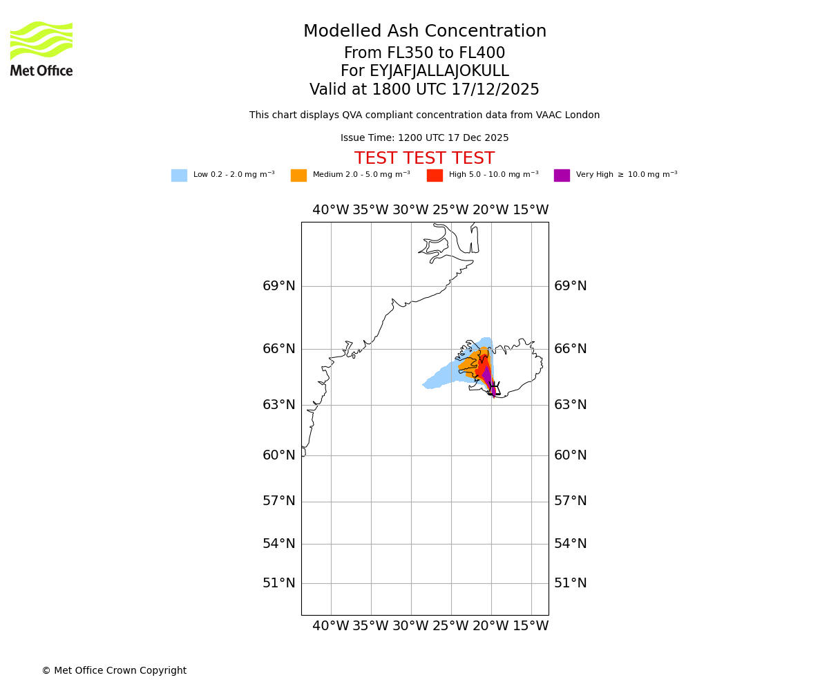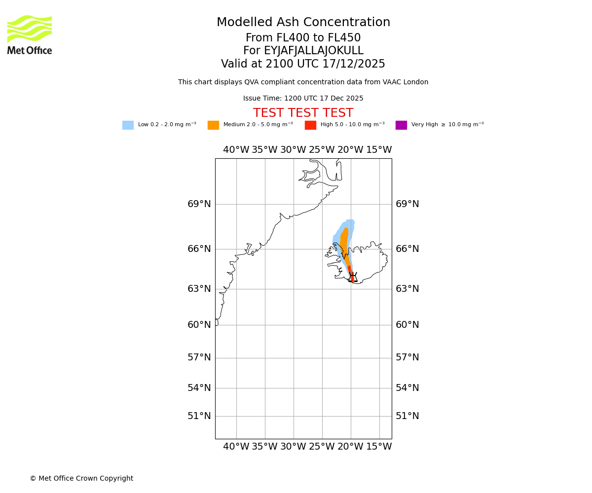 Modelled ash concentration from 400 to 450 for EYJAFJALLAJOKULL. Valid at 1800 UTC 17/12/2025