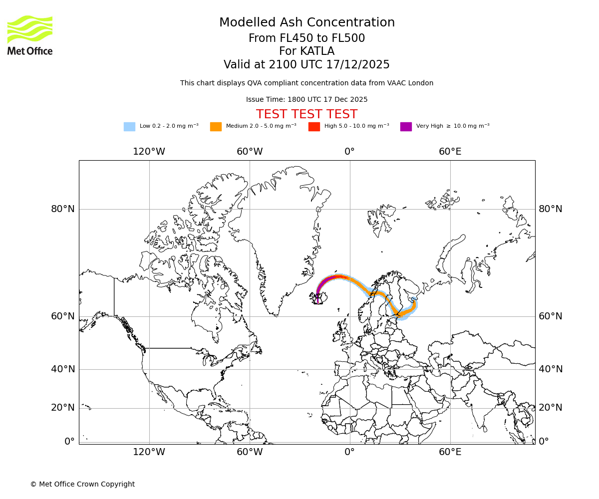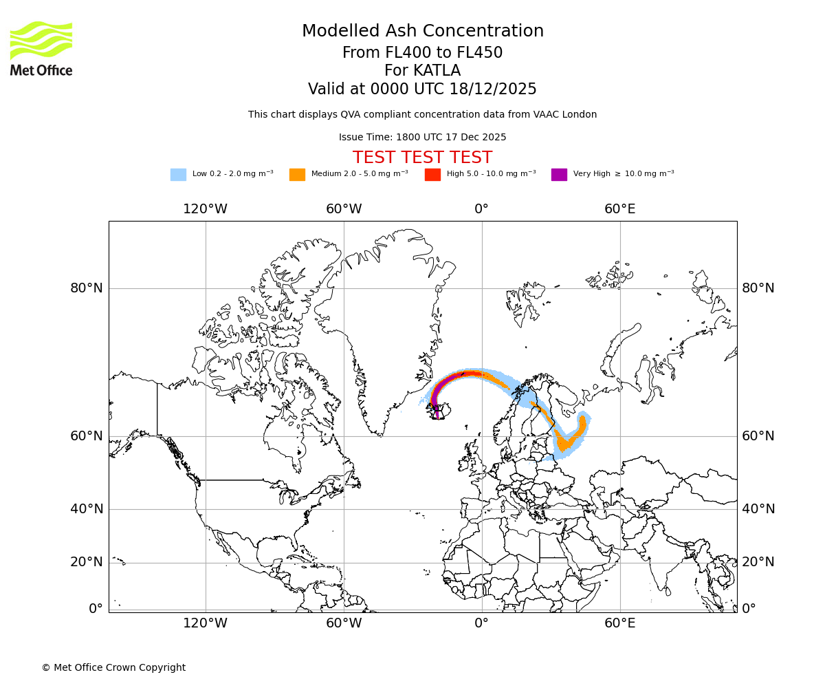 Modelled ash concentration from 400 to 450 for KATLA. Valid at 2100 UTC 17/12/2025
