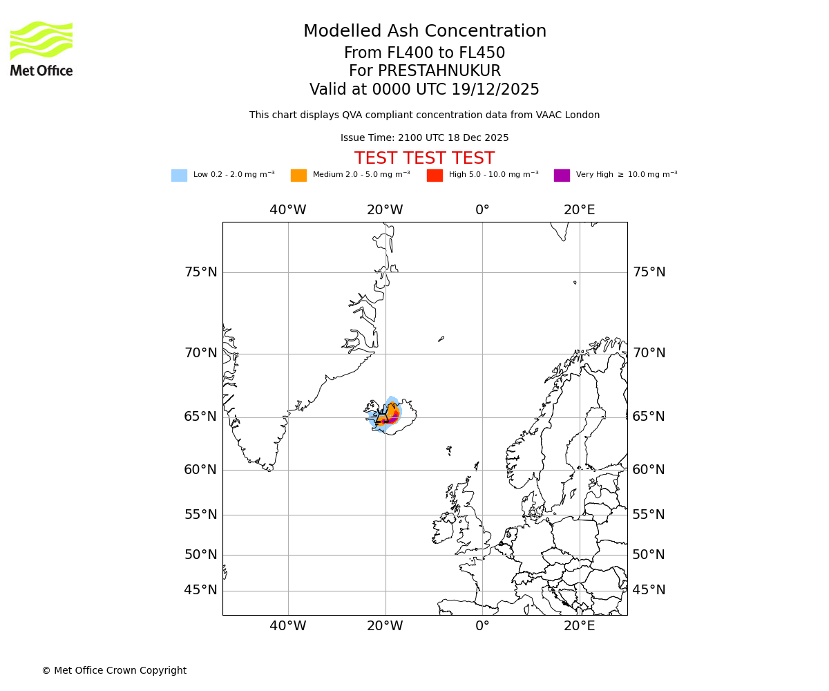 Modelled ash concentration from 400 to 450 for PRESTAHNUKUR. Valid at 2100 UTC 18/12/2025