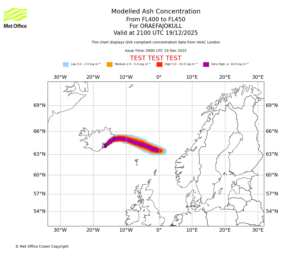 Modelled ash concentration from 400 to 450 for ORAEFAJOKULL. Valid at 1800 UTC 19/12/2025