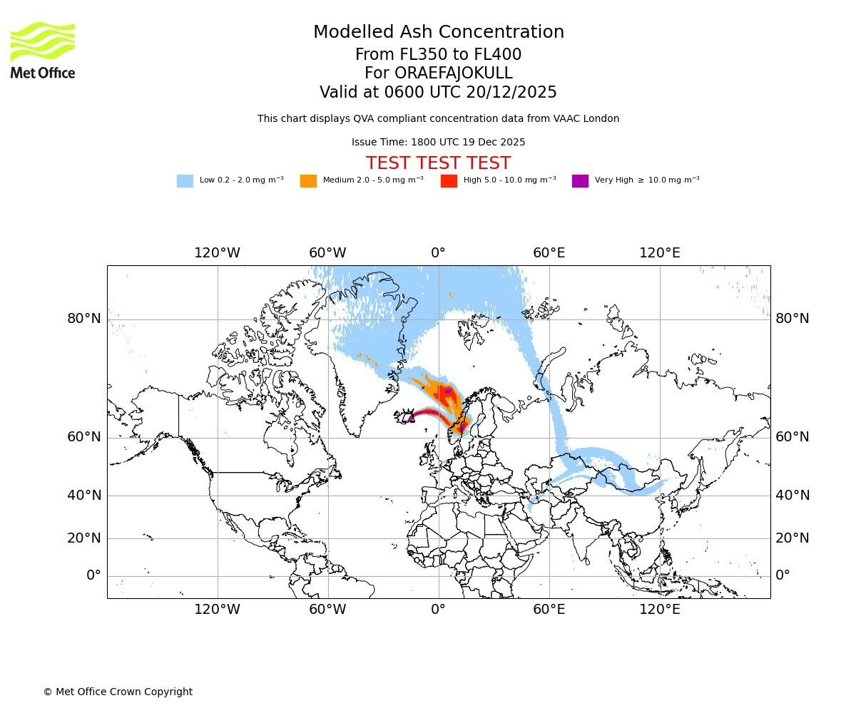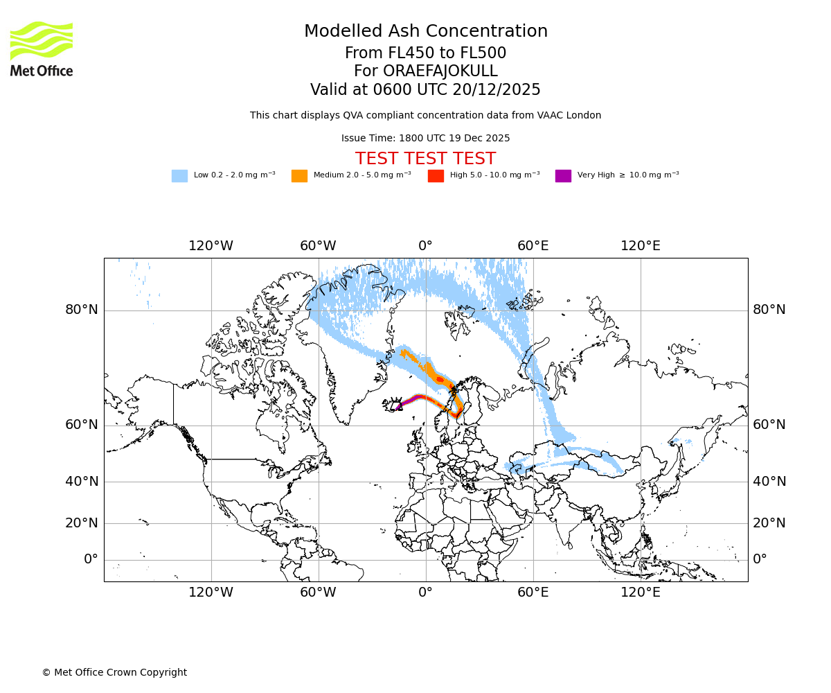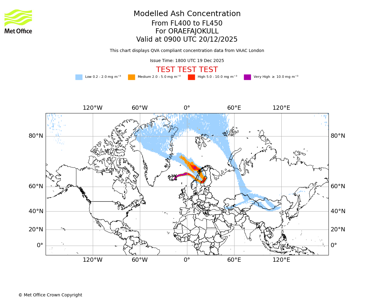 Modelled ash concentration from 400 to 450 for ORAEFAJOKULL. Valid at 0600 UTC 20/12/2025