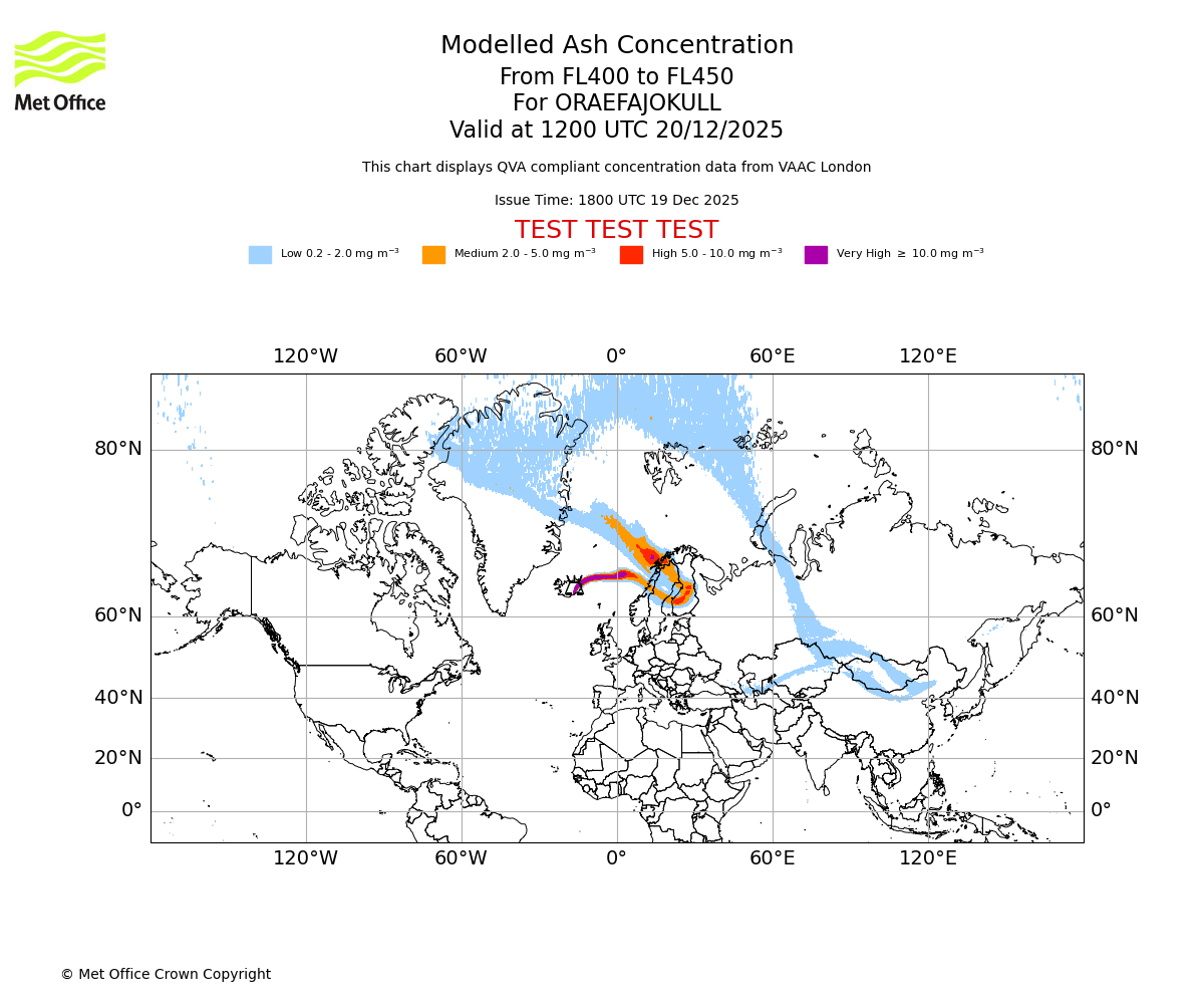 Modelled ash concentration from 400 to 450 for ORAEFAJOKULL. Valid at 0900 UTC 20/12/2025