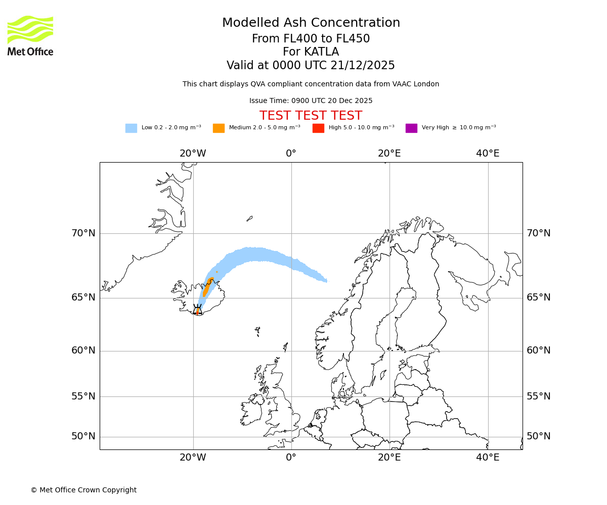 Modelled ash concentration from 400 to 450 for KATLA. Valid at 2100 UTC 20/12/2025