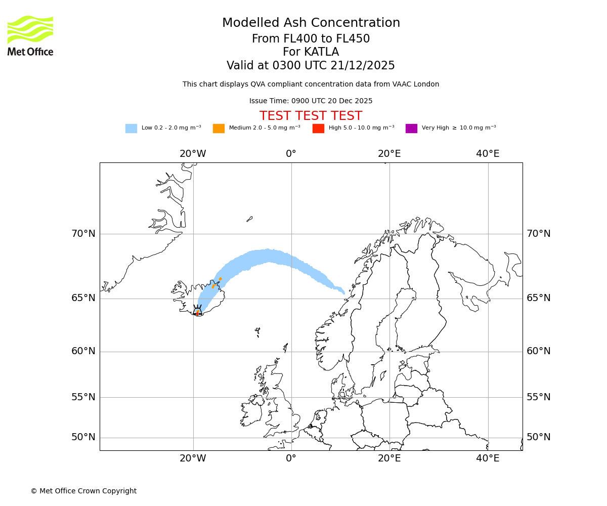 Modelled ash concentration from 400 to 450 for KATLA. Valid at 0000 UTC 21/12/2025
