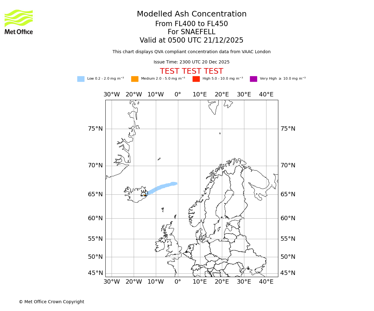 Modelled ash concentration from 400 to 450 for SNAEFELL. Valid at 0200 UTC 21/12/2025