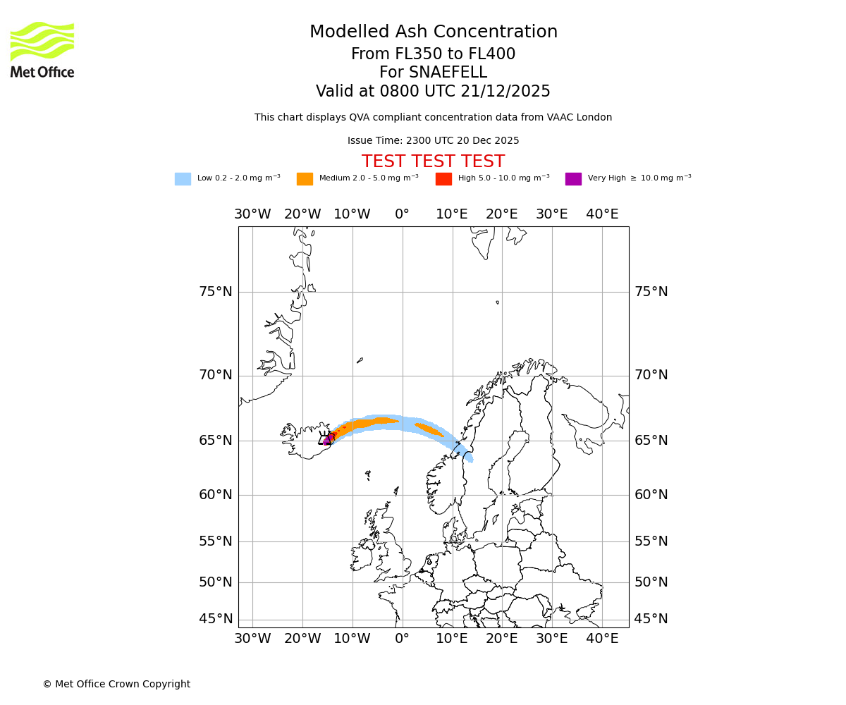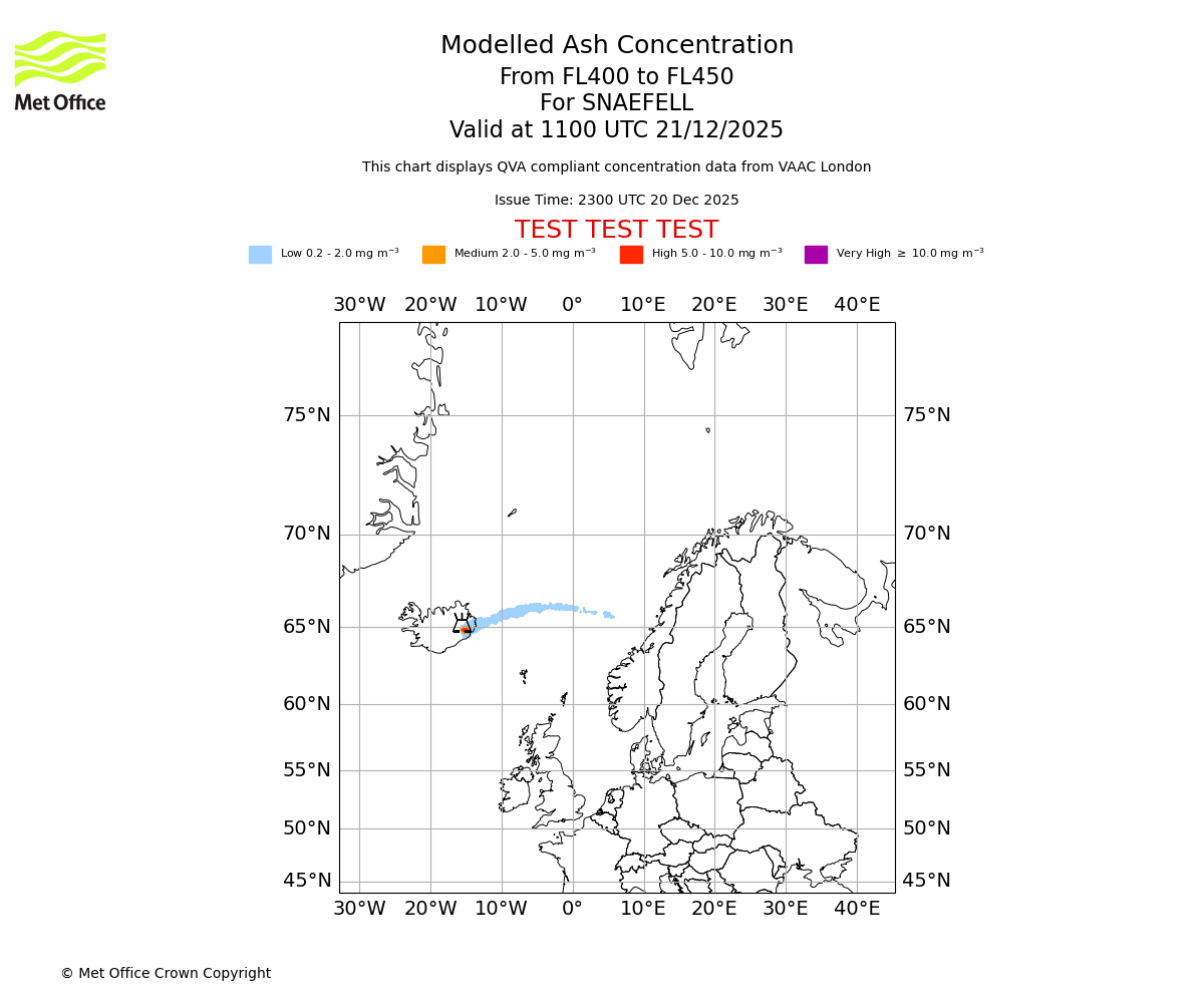 Modelled ash concentration from 400 to 450 for SNAEFELL. Valid at 0800 UTC 21/12/2025