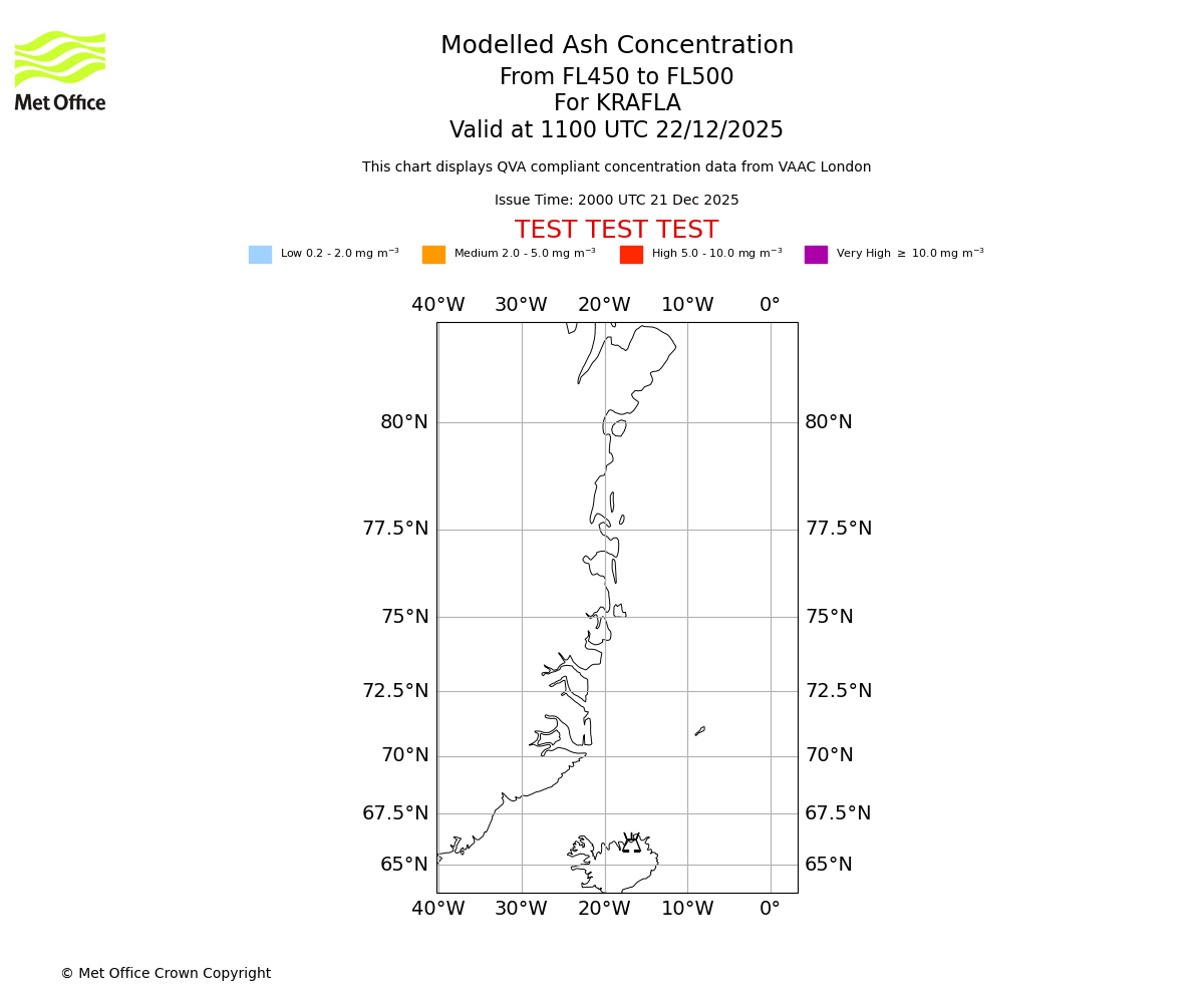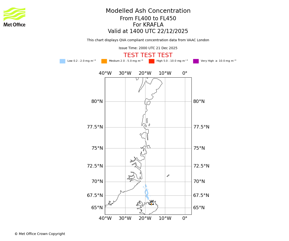 Modelled ash concentration from 400 to 450 for KRAFLA. Valid at 1100 UTC 22/12/2025