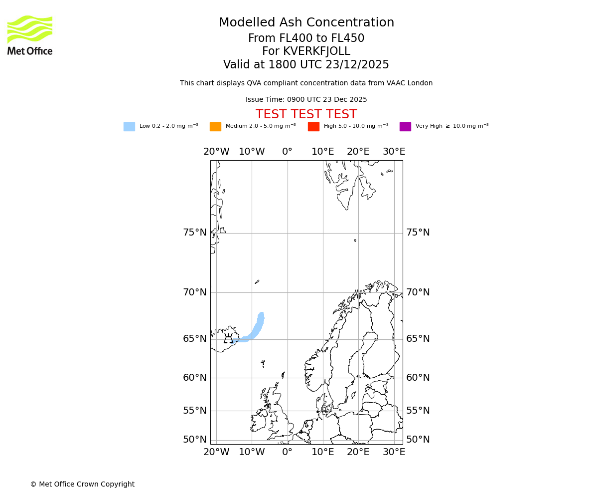 Modelled ash concentration from 400 to 450 for KVERKFJOLL. Valid at 1500 UTC 23/12/2025