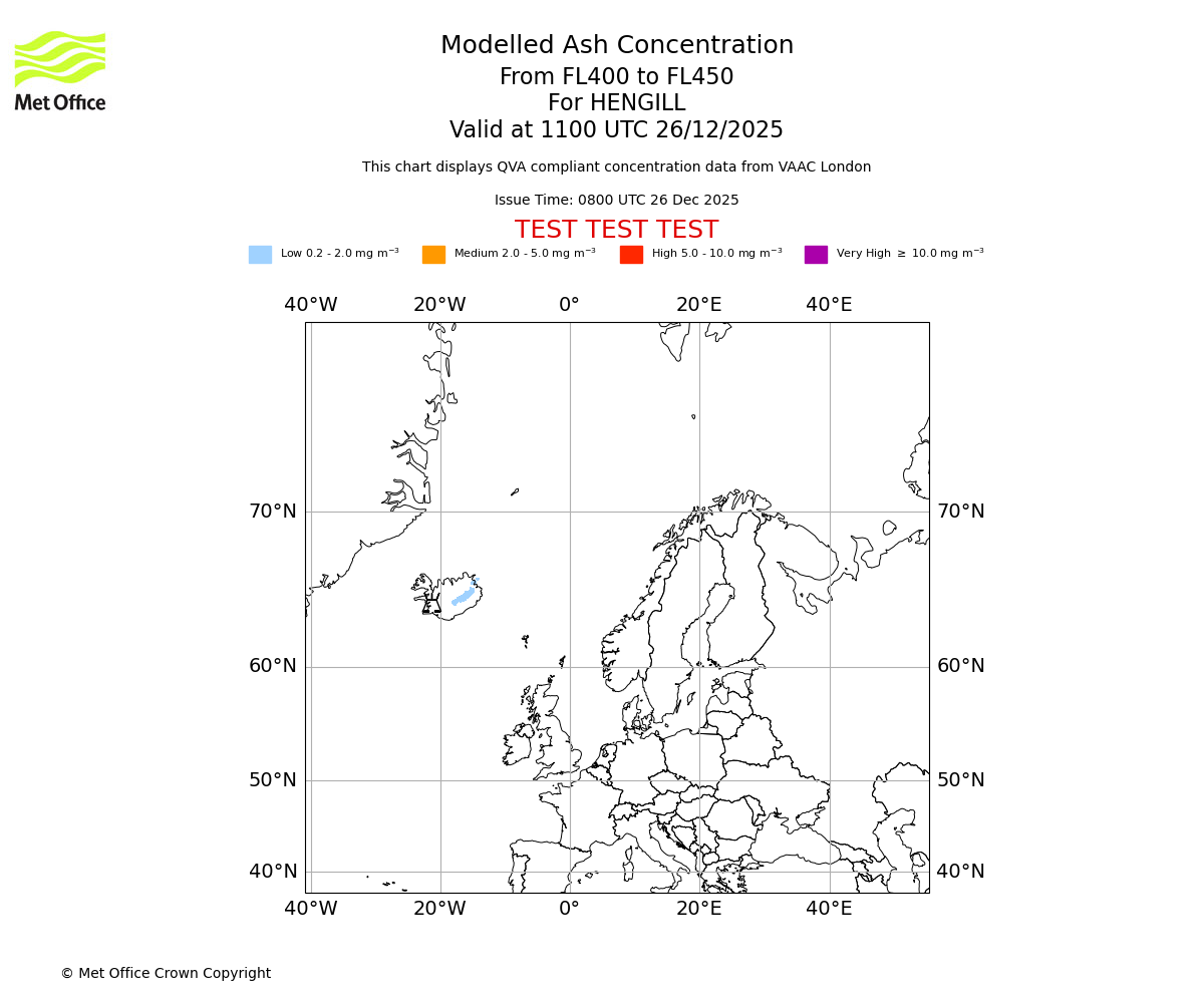Modelled ash concentration from 400 to 450 for HENGILL. Valid at 0800 UTC 26/12/2025