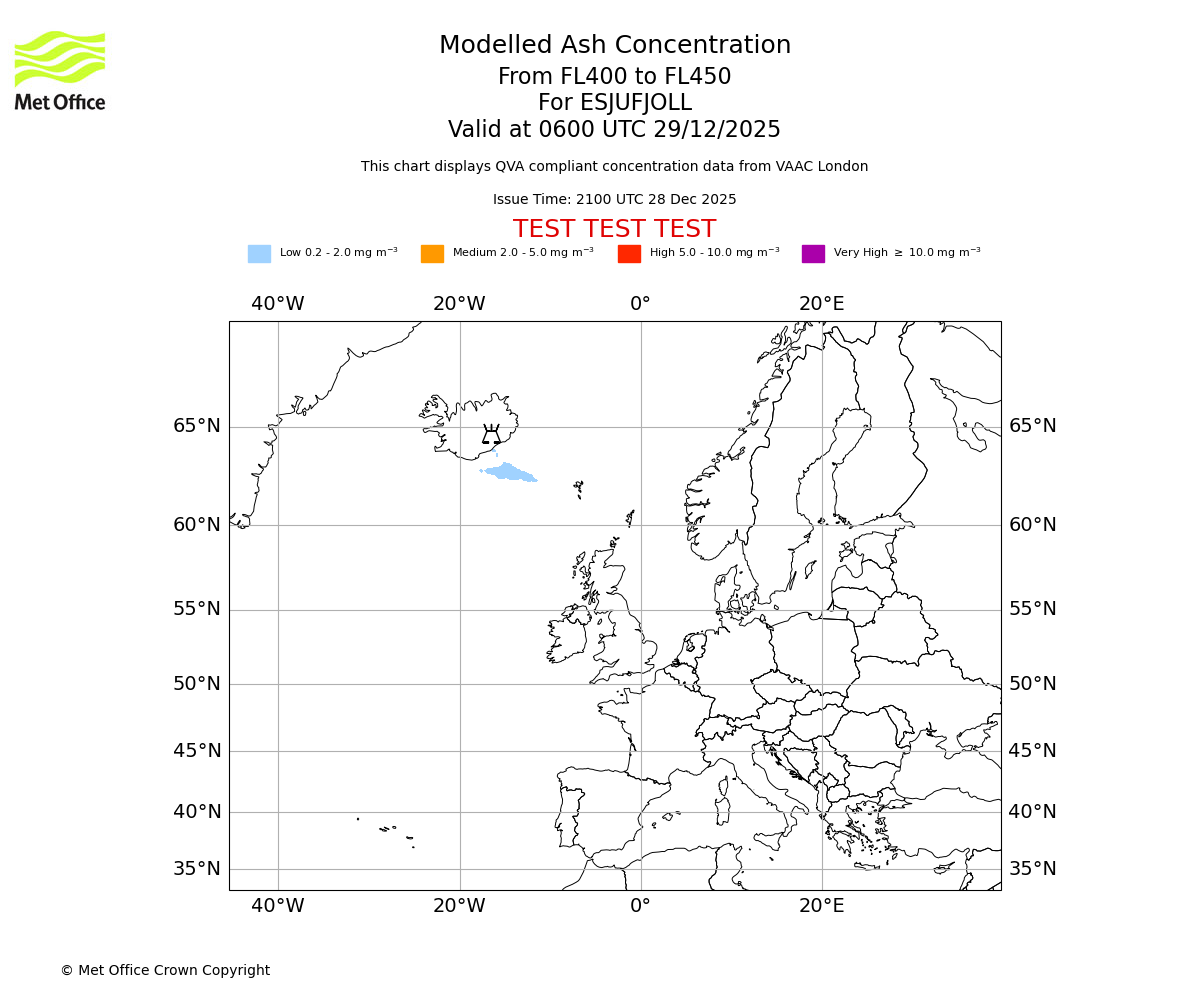 Modelled ash concentration from 400 to 450 for ESJUFJOLL. Valid at 0300 UTC 29/12/2025