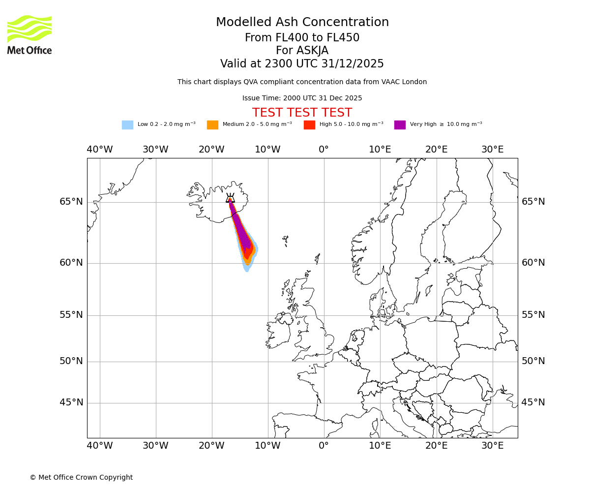Modelled ash concentration from 400 to 450 for ASKJA. Valid at 2000 UTC 31/12/2025