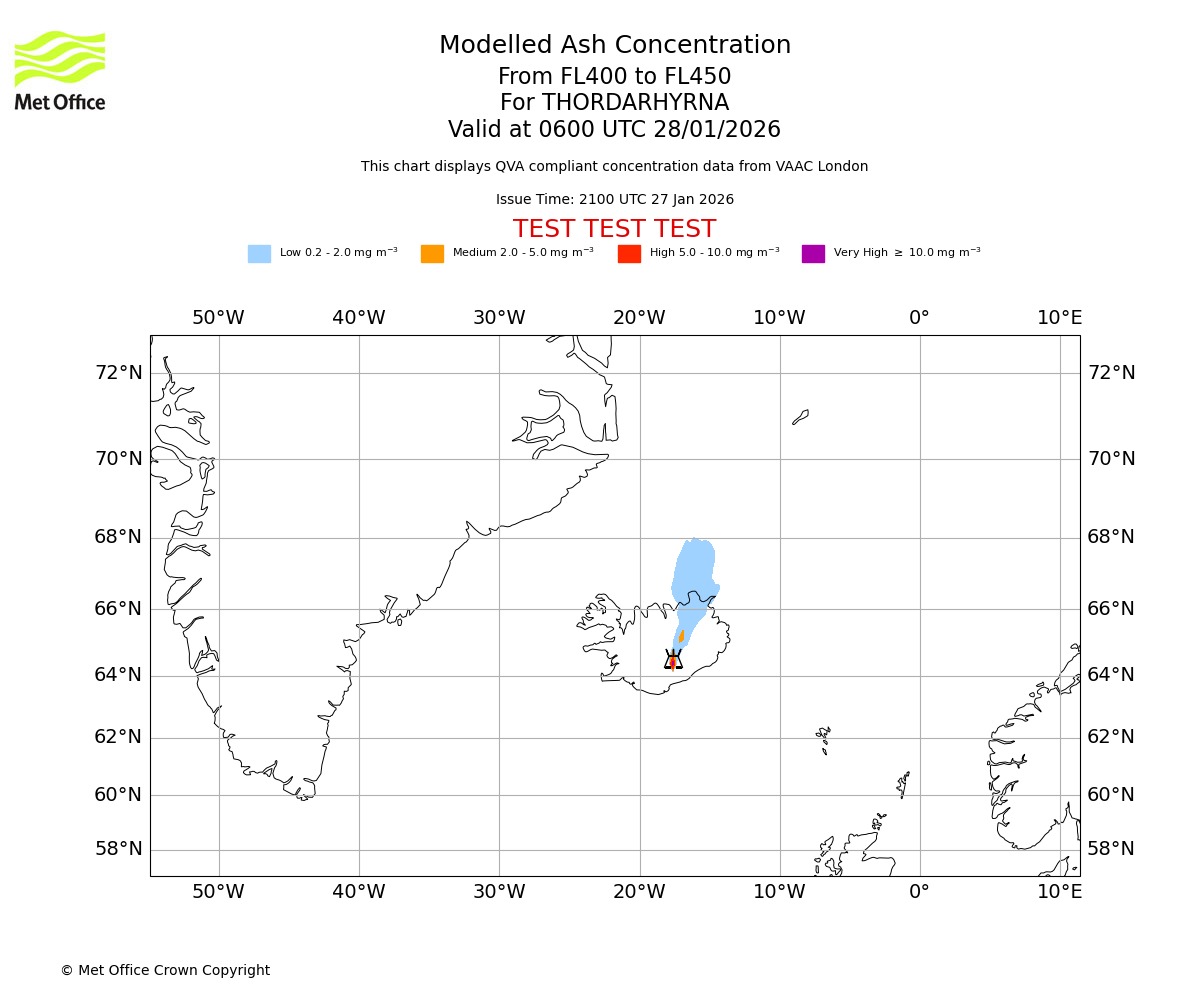 Modelled ash concentration from 400 to 450 for THORDARHYRNA. Valid at 0300 UTC 28/01/2026