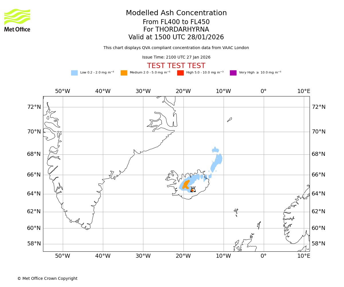 Modelled ash concentration from 400 to 450 for THORDARHYRNA. Valid at 1200 UTC 28/01/2026