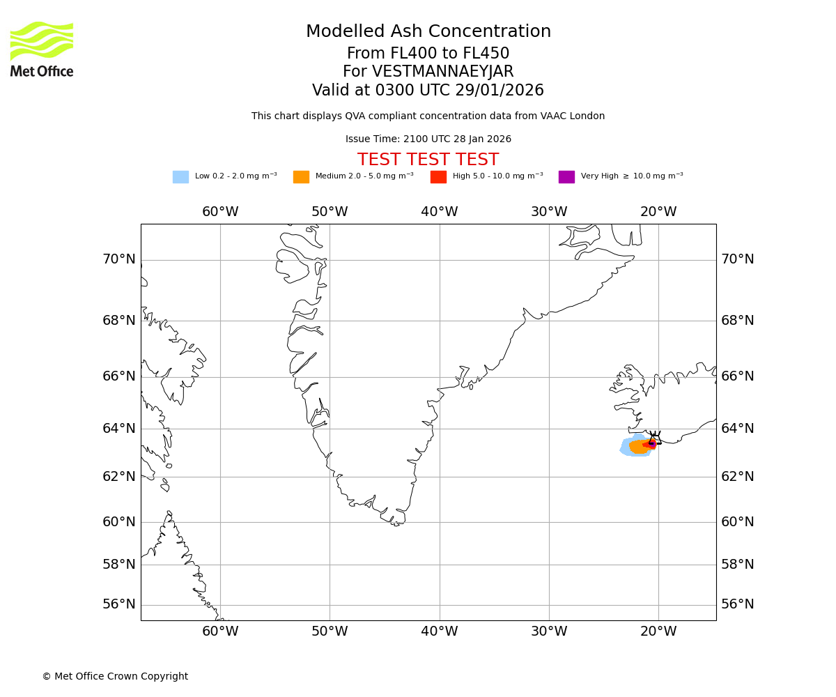 Modelled ash concentration from 400 to 450 for VESTMANNAEYJAR. Valid at 0000 UTC 29/01/2026