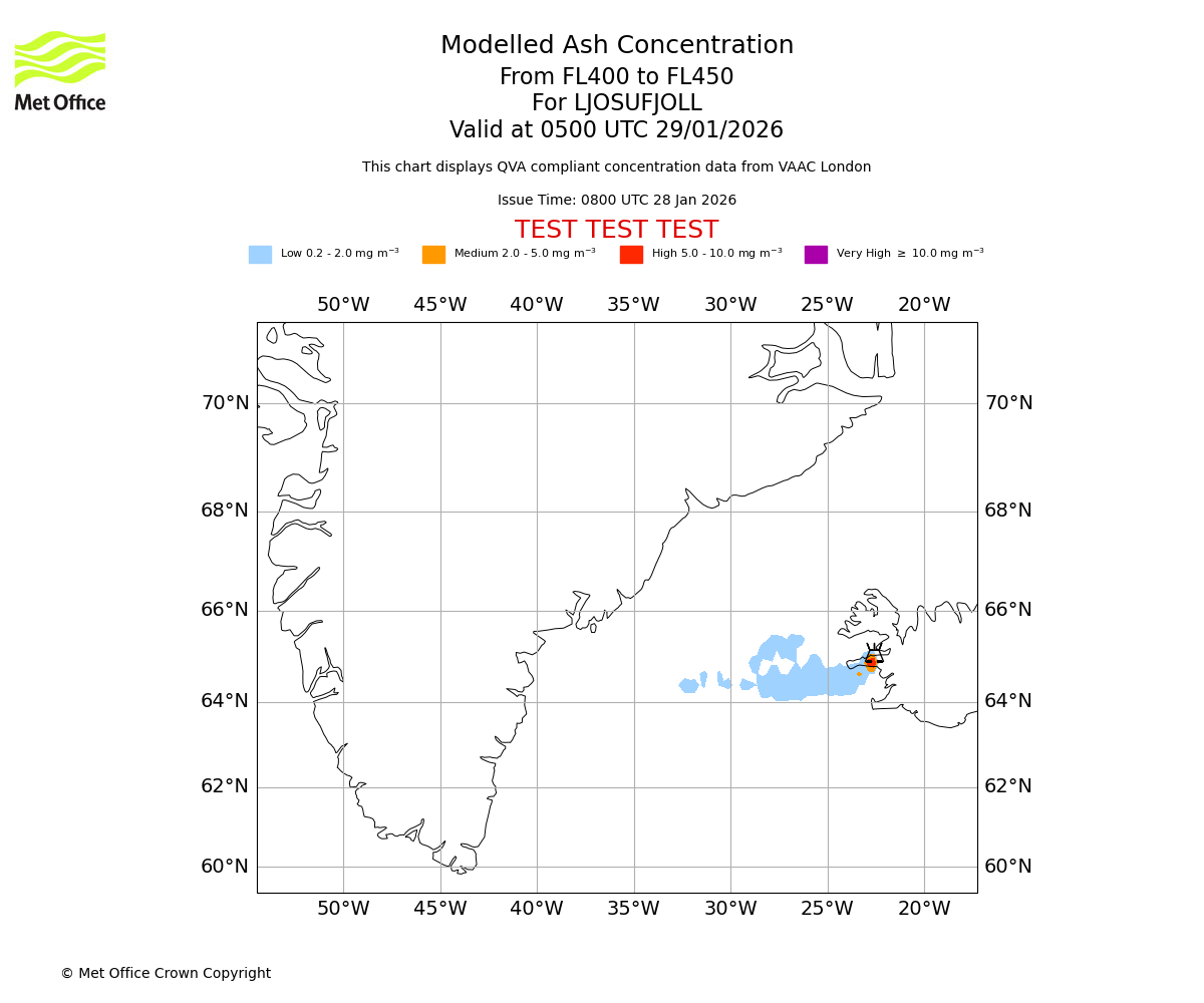 Modelled ash concentration from 400 to 450 for LJOSUFJOLL. Valid at 0200 UTC 29/01/2026