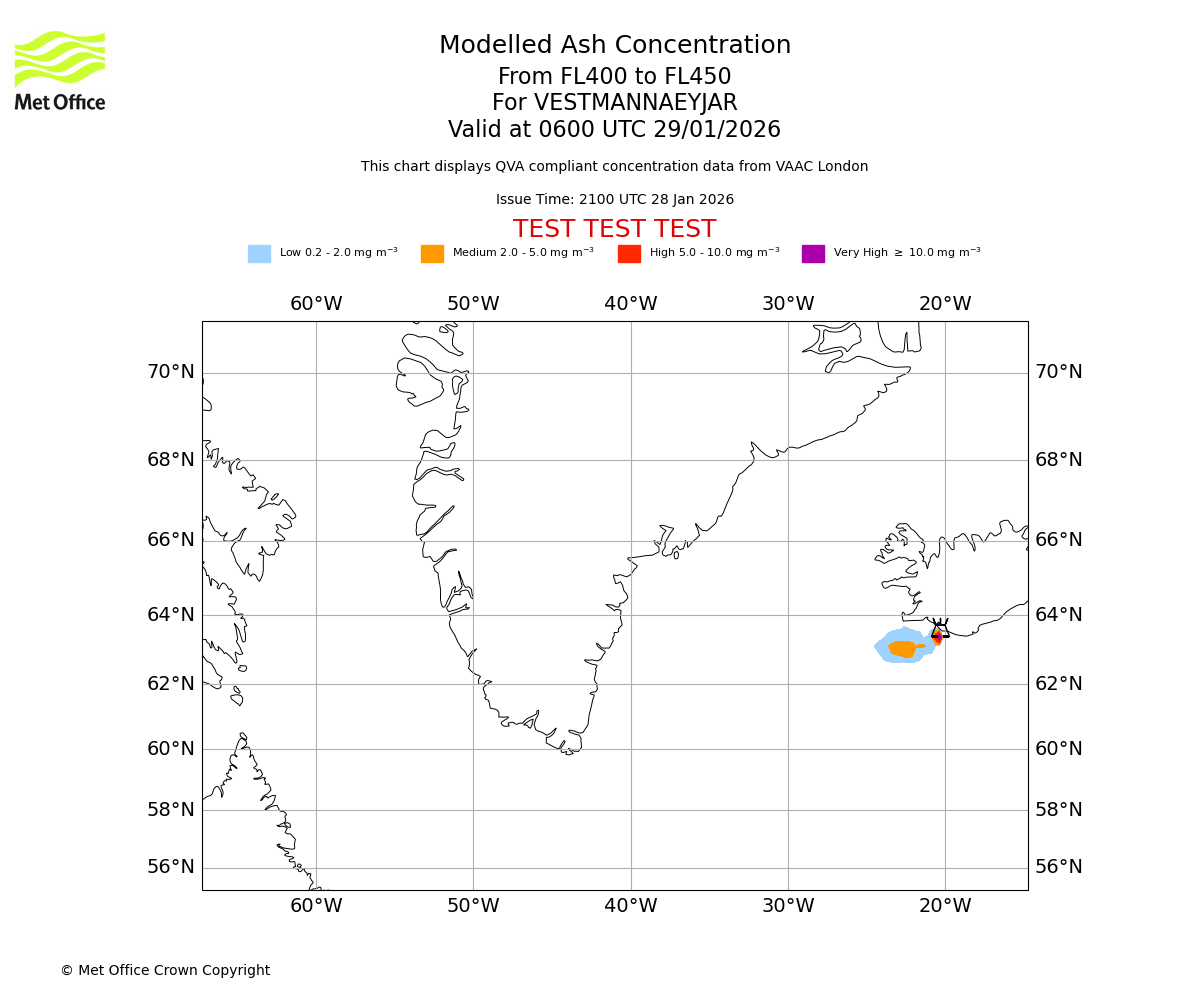 Modelled ash concentration from 400 to 450 for VESTMANNAEYJAR. Valid at 0300 UTC 29/01/2026