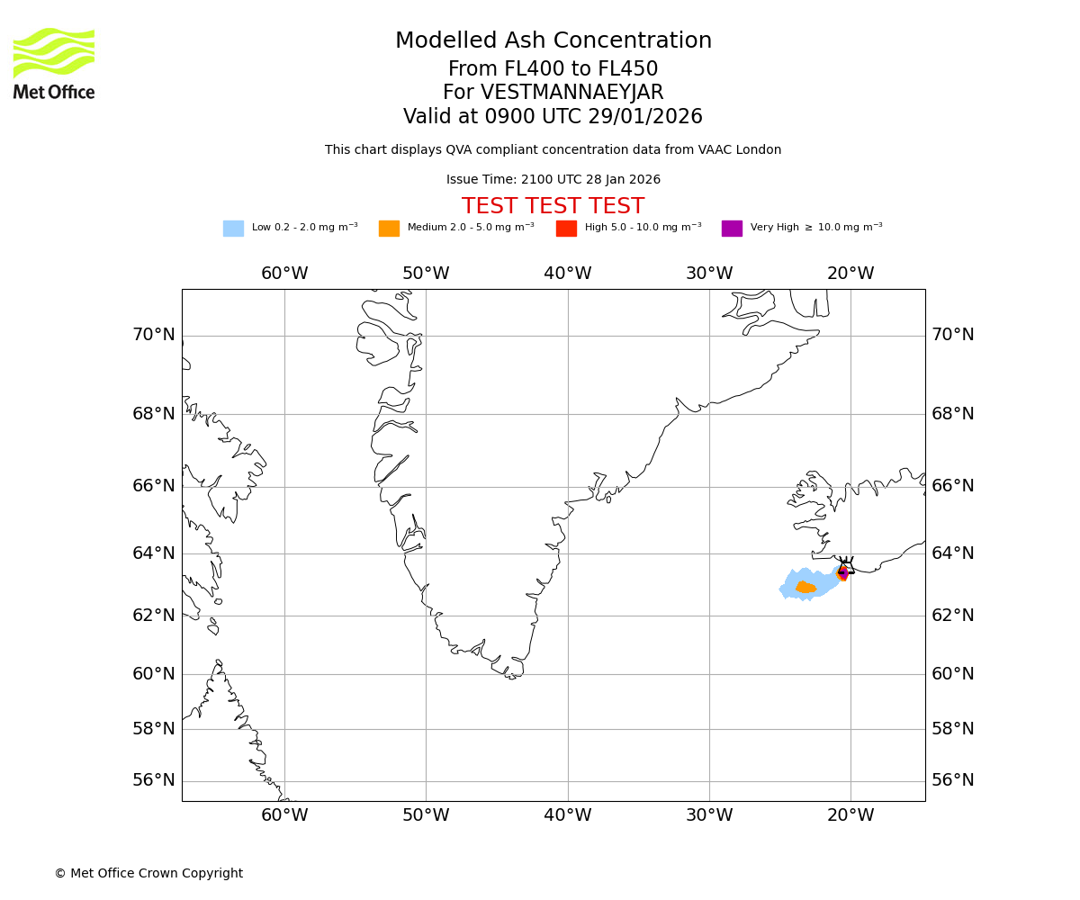 Modelled ash concentration from 400 to 450 for VESTMANNAEYJAR. Valid at 0600 UTC 29/01/2026
