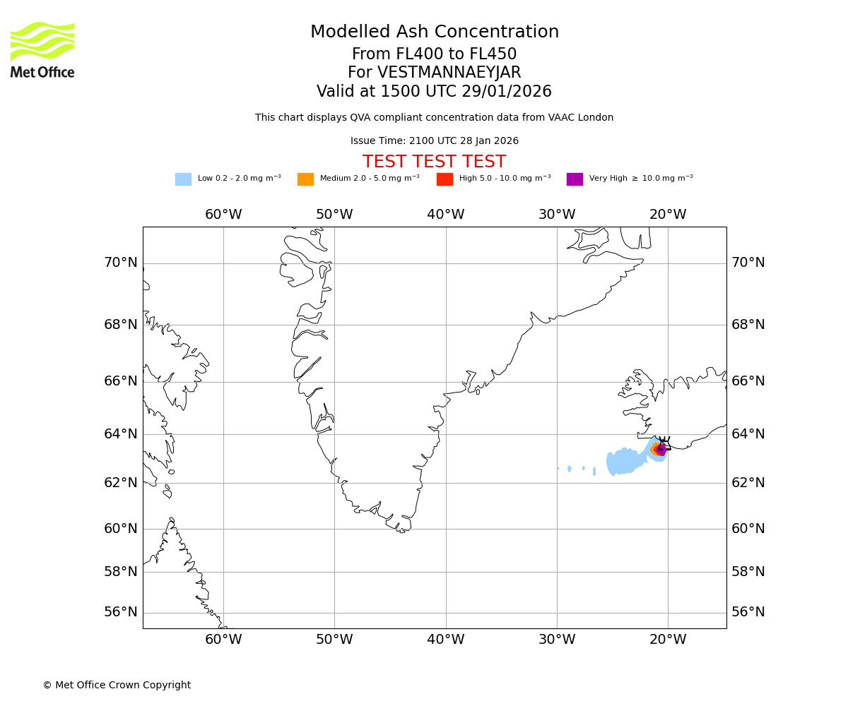 Modelled ash concentration from 400 to 450 for VESTMANNAEYJAR. Valid at 1200 UTC 29/01/2026