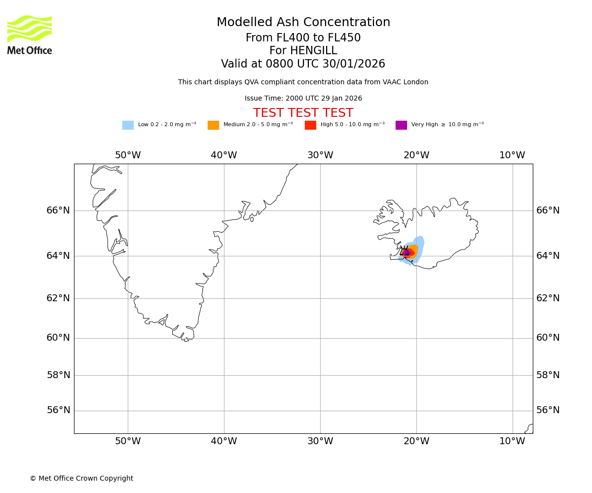 Modelled ash concentration from 400 to 450 for HENGILL. Valid at 0500 UTC 30/01/2026