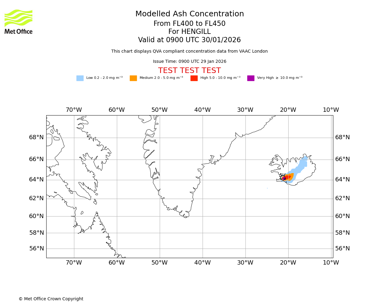 Modelled ash concentration from 400 to 450 for HENGILL. Valid at 0600 UTC 30/01/2026