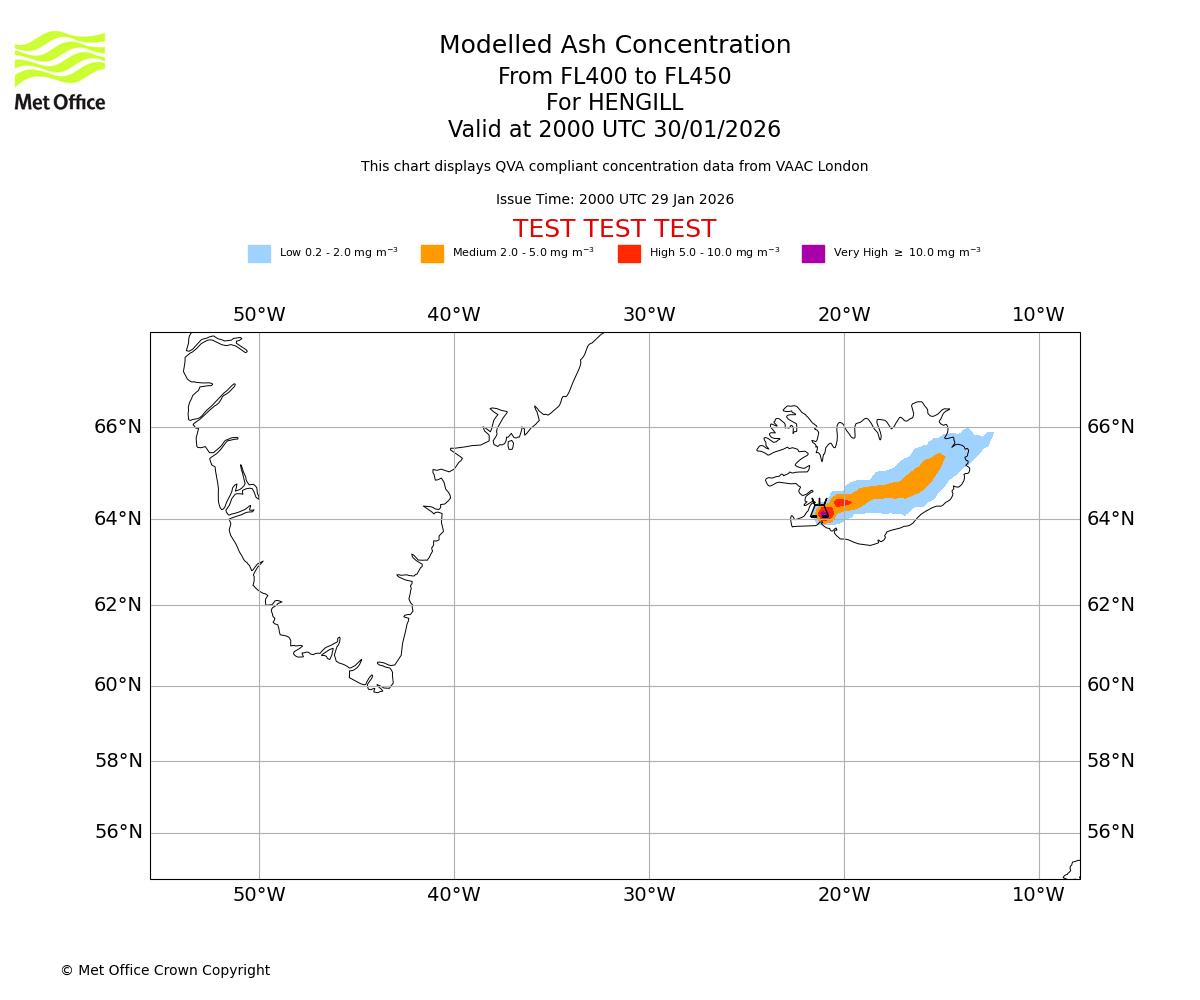 Modelled ash concentration from 000 to 200 for HENGILL. Valid at 2000 UTC 29/01/2026