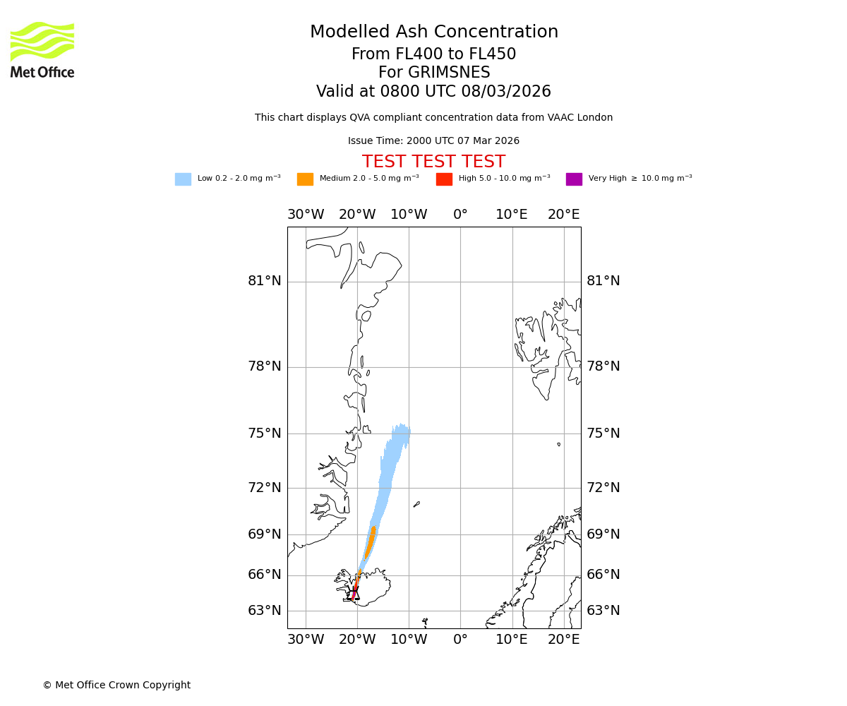 Modelled ash concentration from 000 to 200 for GRIMSNES. Valid at 2000 UTC 07/03/2026