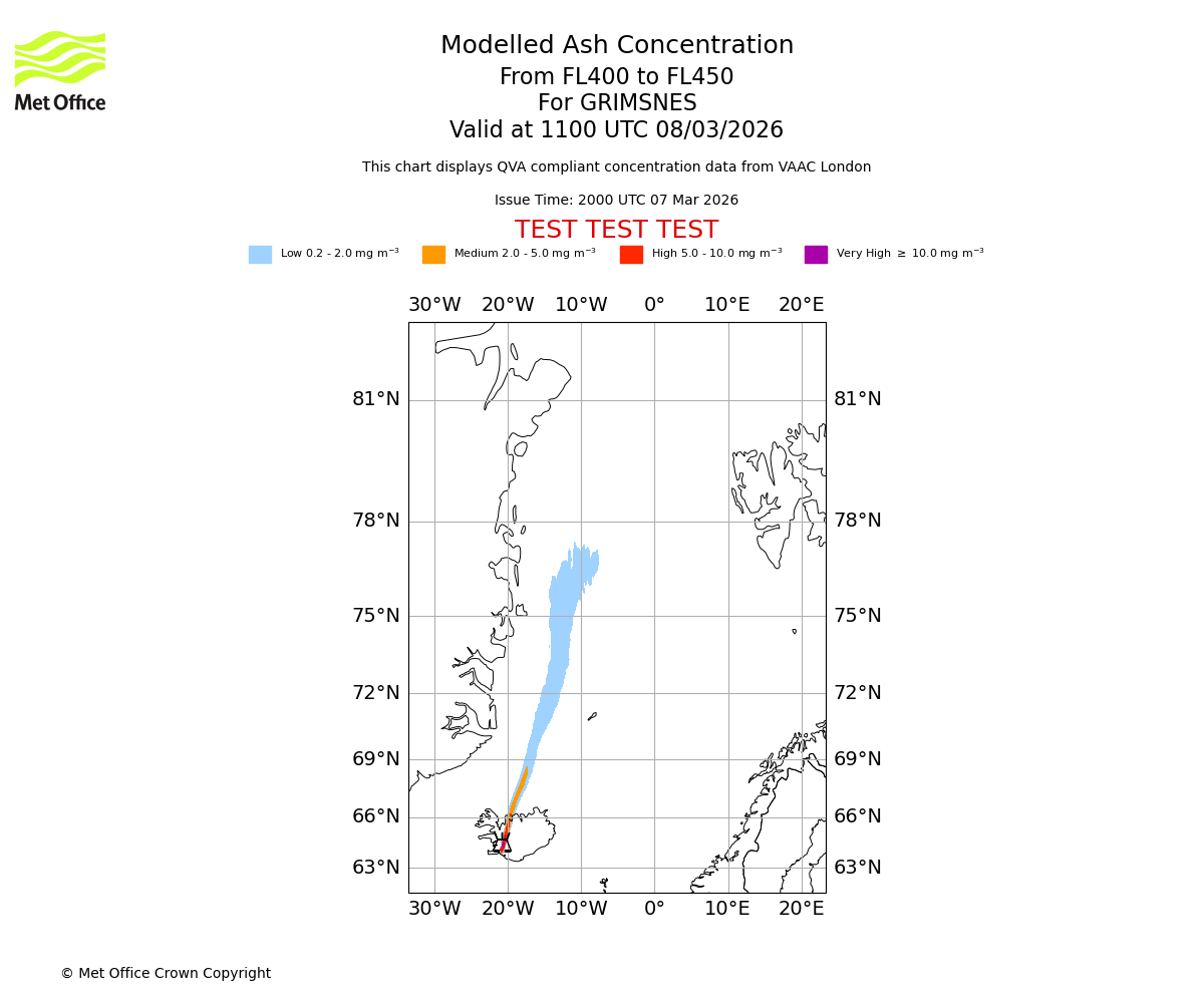 Modelled ash concentration from 400 to 450 for GRIMSNES. Valid at 0800 UTC 08/03/2026