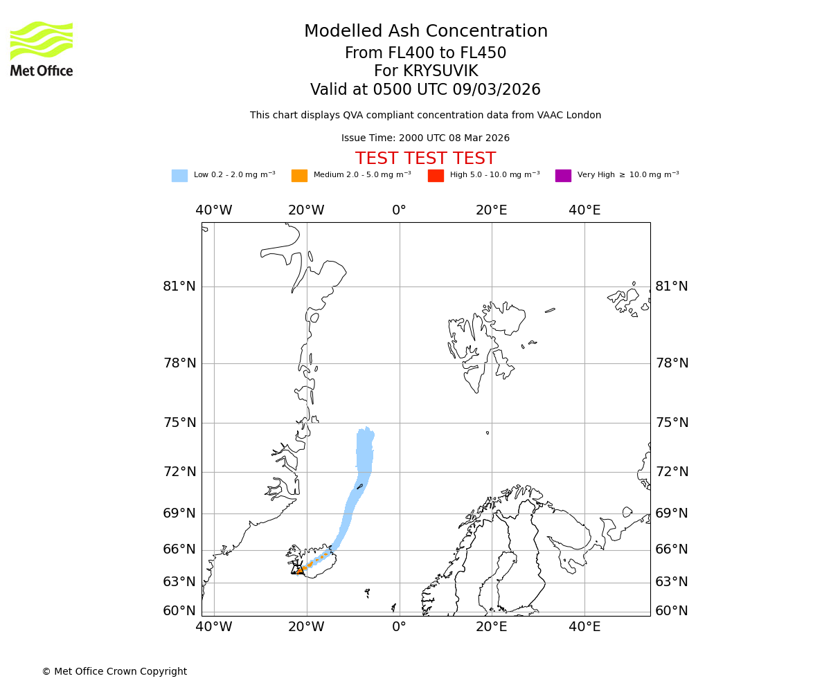Modelled ash concentration from 400 to 450 for KRYSUVIK. Valid at 0200 UTC 09/03/2026