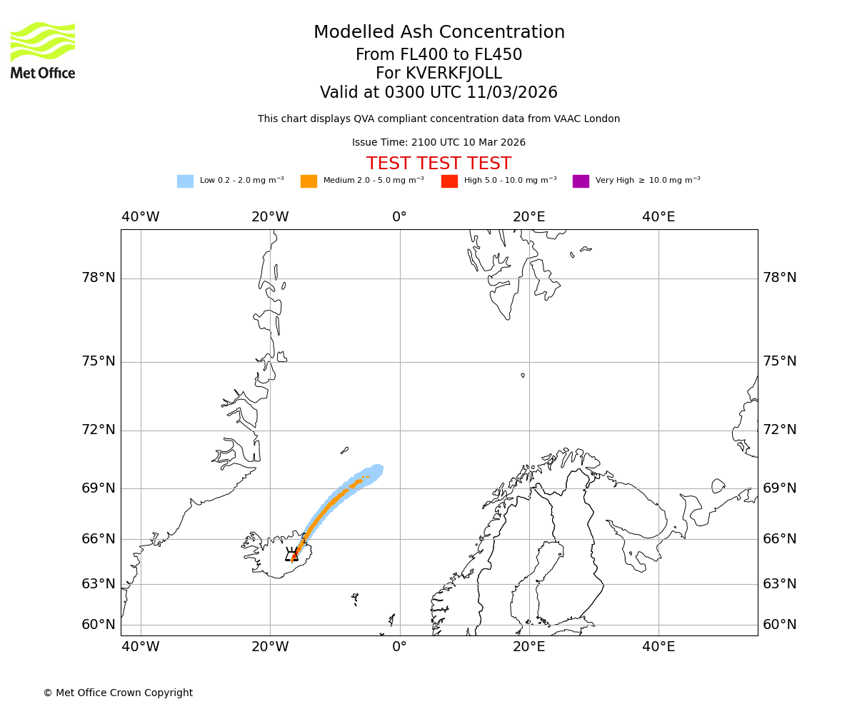 Modelled ash concentration from 400 to 450 for KVERKFJOLL. Valid at 0000 UTC 11/03/2026