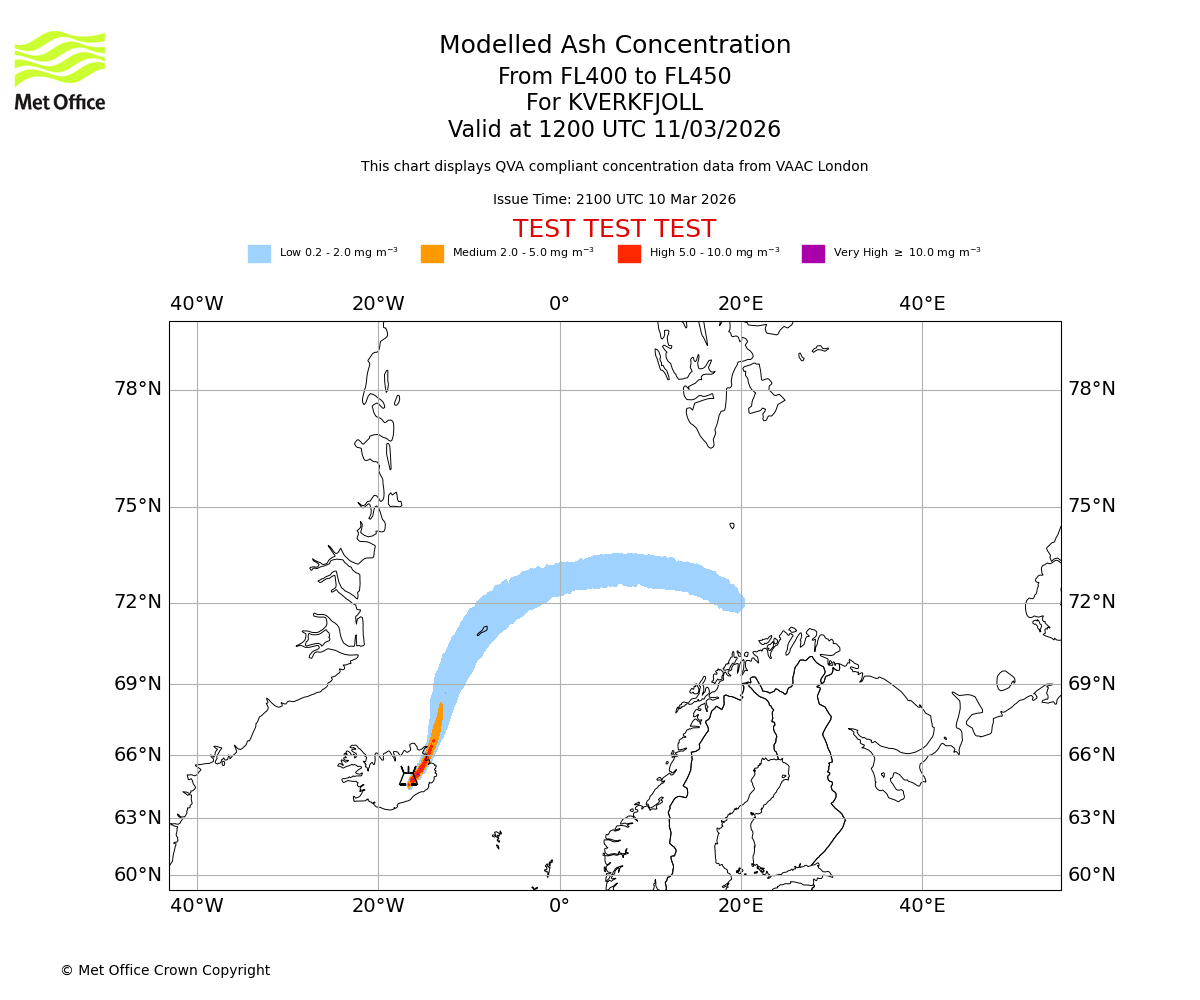 Modelled ash concentration from 400 to 450 for KVERKFJOLL. Valid at 0900 UTC 11/03/2026