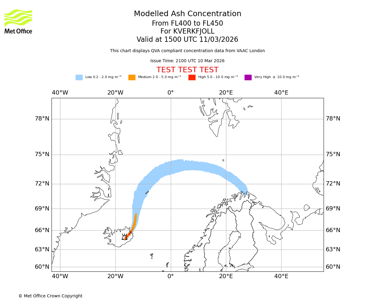 Modelled ash concentration from 400 to 450 for KVERKFJOLL. Valid at 1200 UTC 11/03/2026