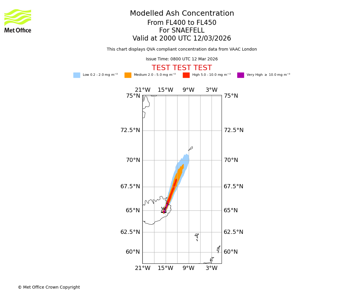 Modelled ash concentration from 400 to 450 for SNAEFELL. Valid at 1700 UTC 12/03/2026
