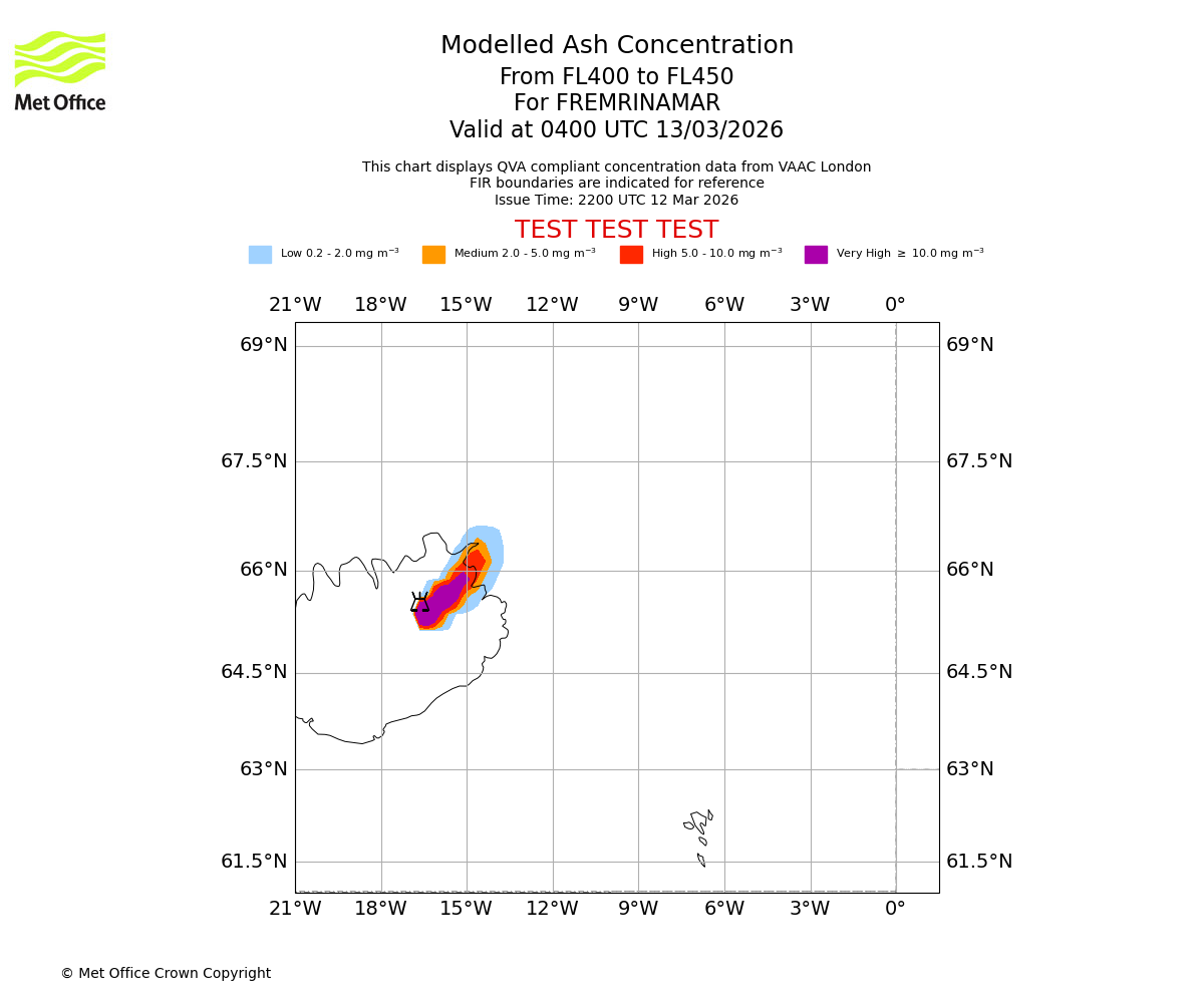 Modelled ash concentration from 400 to 450 for FREMRINAMAR. Valid at 0100 UTC 13/03/2026