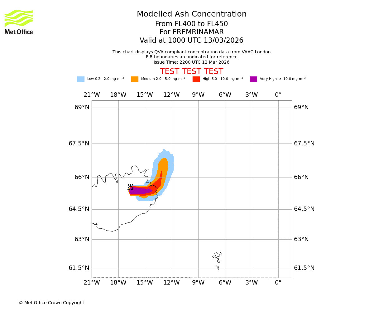 Modelled ash concentration from 400 to 450 for FREMRINAMAR. Valid at 0700 UTC 13/03/2026
