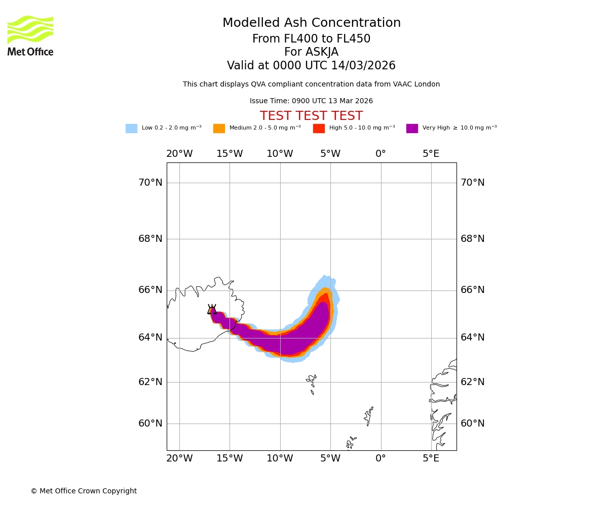 Modelled ash concentration from 400 to 450 for ASKJA. Valid at 2100 UTC 13/03/2026