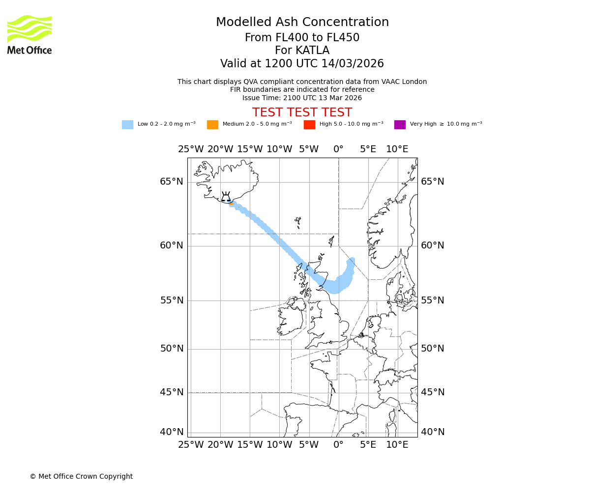 Modelled ash concentration from 400 to 450 for KATLA. Valid at 0900 UTC 14/03/2026