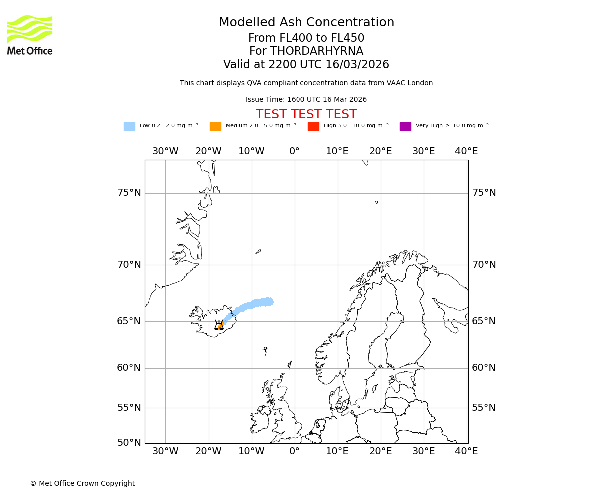 Modelled ash concentration from 400 to 450 for THORDARHYRNA. Valid at 1900 UTC 16/03/2026