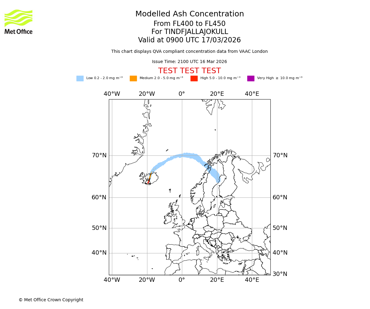 Modelled ash concentration from 400 to 450 for TINDFJALLAJOKULL. Valid at 0600 UTC 17/03/2026